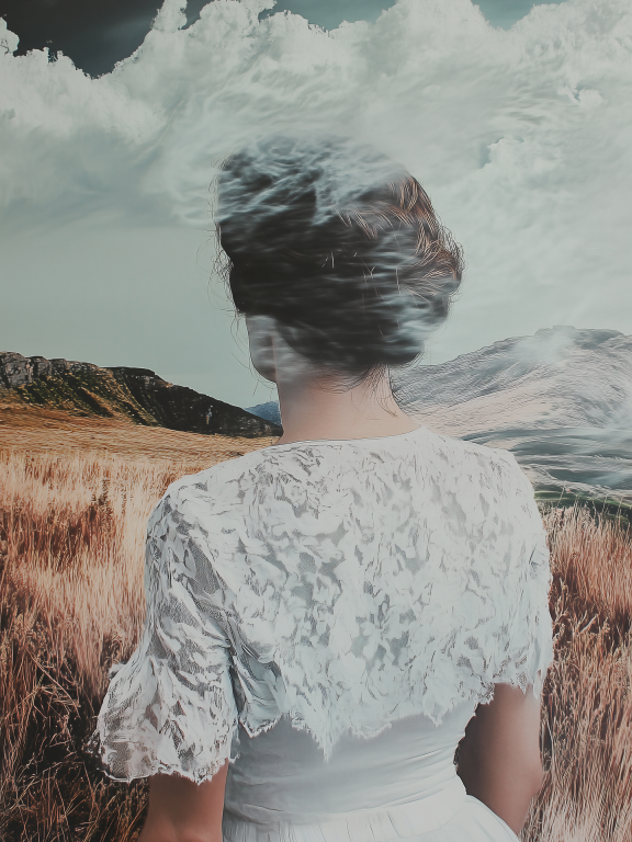 Head in Clouds toont een poëtische compositie waarin een vrouw in witte kledij zich omkeen kijkt naar een dramatisch wolkenlandschap dat letterlijk samenvloeit met haar gedachten. De surrealistische techniek creëert een dromerige verbinding tussen de fysieke en mentale wereld, waarbij de grens tussen realiteit en verbeelding vervaagt. De zachte kleuren en de romantische sfeer geven het kunstwerk een contemplatieve uitstraling die uitnodigt tot reflectie. Dit inspirerende meesterwerk symboliseert de kracht van dromen en de vrijheid van gedachten.