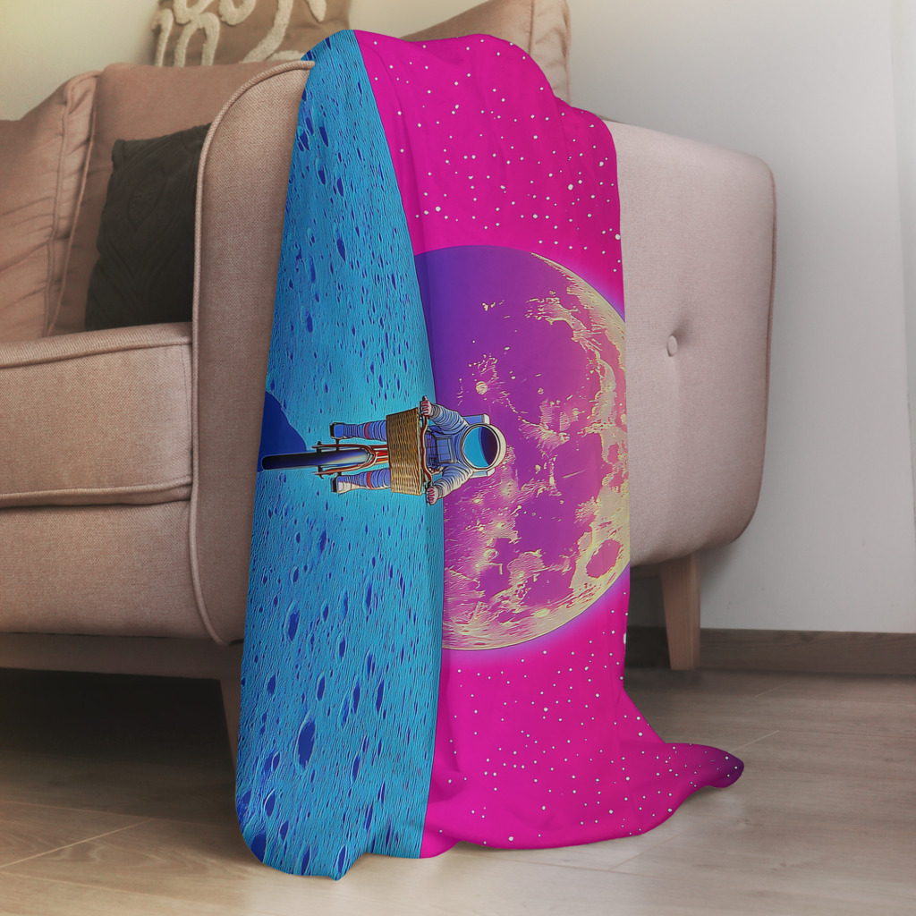 Een astronaut fietst over een ruig landschap onder een magische, neonroze sterrenhemel met een gigantische, gloeiende maan op de achtergrond. De scène straalt een speelse mix uit van nostalgie en futurisme, ruimteverkenning lijkt een alledaagse activiteit geworden. De contrasterende kleuren, diepe blauwtinten van de maan en de felle roze hemel geven het beeld een dromerige, surrealistische sfeer.