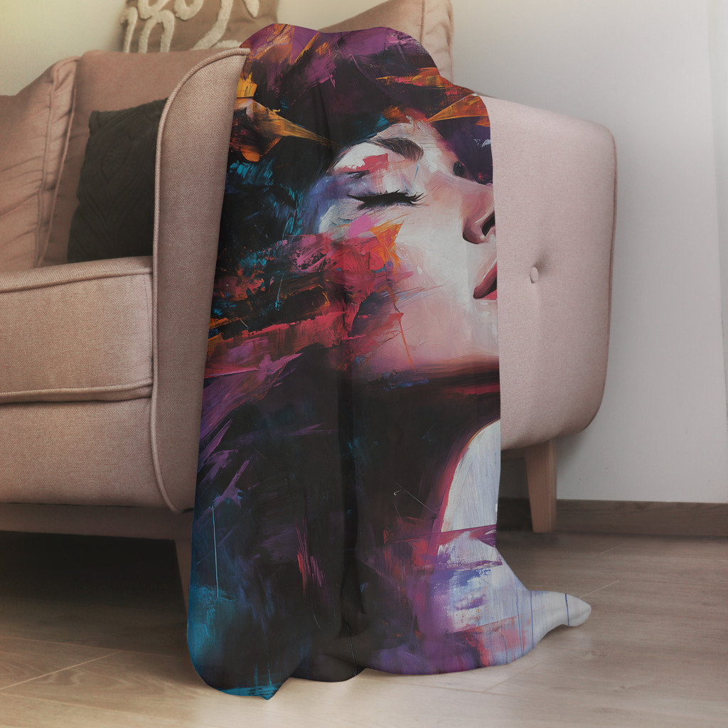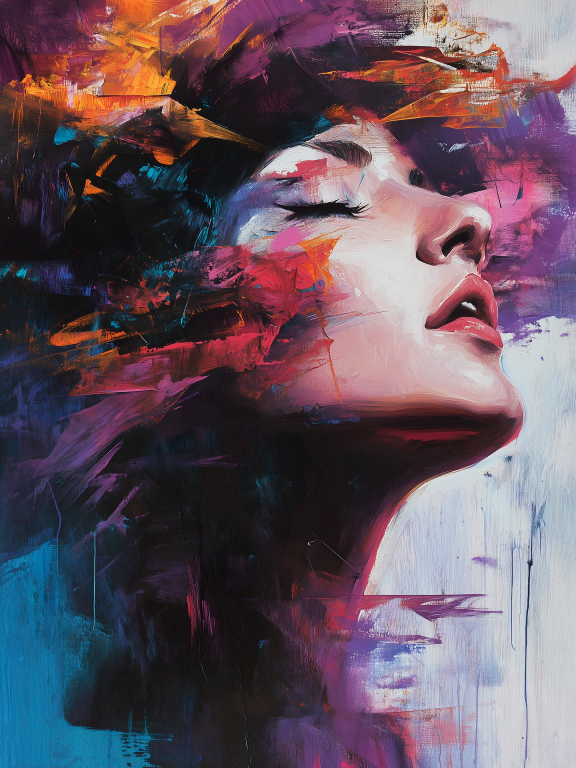 Mind of a Woman toont een expressief portret waarin emotie en kleur explosief samenkomen in abstracte penseelstreken van paars, oranje en blauw. De vrouw met gesloten ogen lijkt verloren in gedachten, terwijl de dynamische verfstreken de complexiteit van innerlijke werelden visualiseren. Dit krachtige kunstwerk combineert figuratieve en abstracte elementen om de rijkdom van vrouwelijke emotie en introspectie te vieren. Perfect voor liefhebbers van moderne portretten die zowel schoonheid als diepgang zoeken.