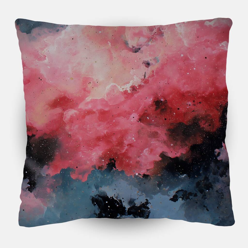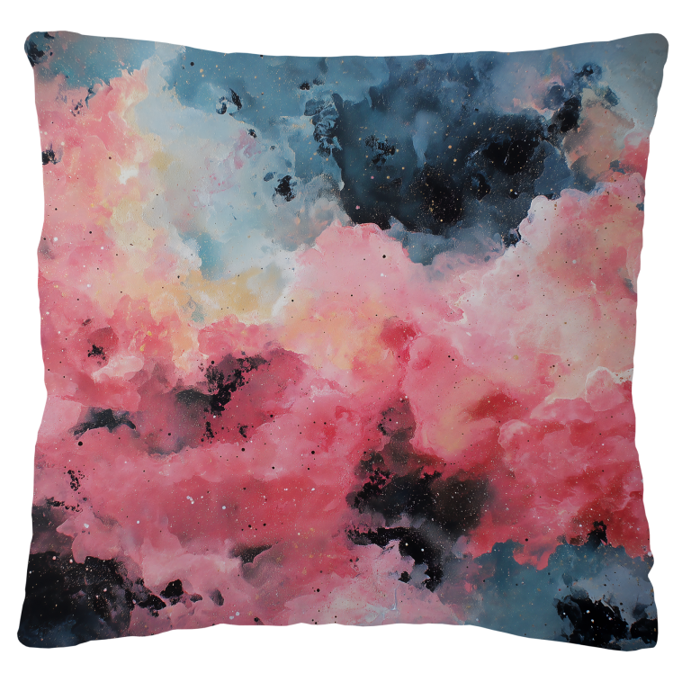 Cloud Collision toont een hemelse dans waar zachte roze en blauwe wolken botsen in een explosie van aquarel schoonheid. Zwarte fragmenten zweven als confetti door de lucht, wat een contrast vormt met de zachte pastelkleuren. Dit dromerige kunstwerk vangt het moment waarop storm en sereniteit elkaar ontmoeten, waarbij chaos transformeert tot schoonheid. Een poëtisch statement voor romantische zielen die houden van abstracte natuurinterpretaties.