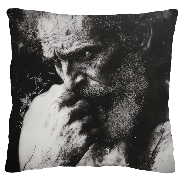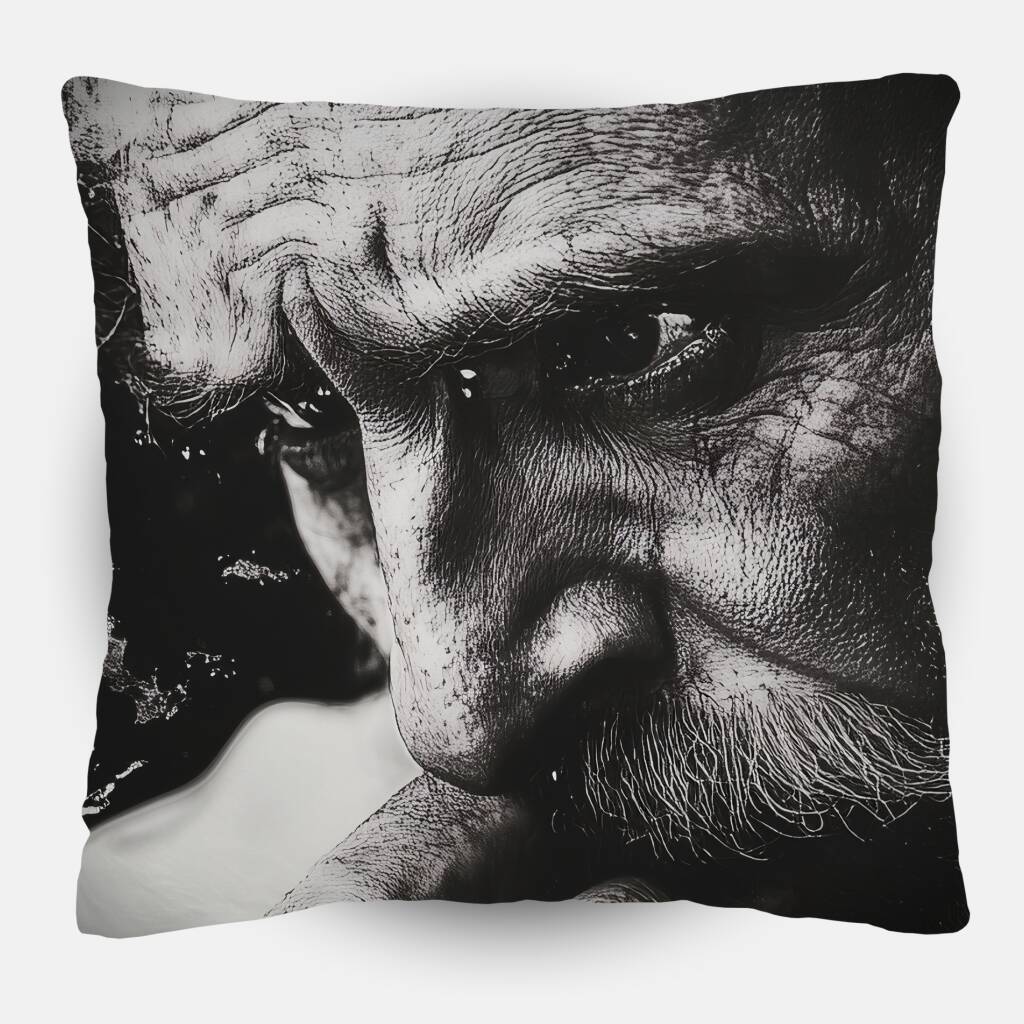 Het kunstwerk "Overthinker" toont een krachtige zwart-wit close-up van een oudere man, diep verzonken in gedachten. Zijn getekende gezicht, borstelige baard en intense blik stralen wijsheid en introspectie uit. De zachte, ruwe texturen rondom hem geven het werk een dromerige en bijna etherische kwaliteit, terwijl het contrast tussen licht en schaduw de emotie versterkt.