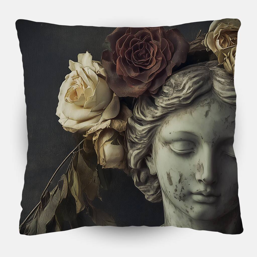 Sleeping Bust is een poëtische meditatie over schoonheid, vergankelijkheid en de tijdloosheid van kunst. Het klassieke sculptuur, gekroond met verwelkende rozen, rust sereen tussen stapels antieke boeken en verdroogd gebladerte. De gesloten ogen van het beeld suggereren een eeuwige droom, terwijl de omringende elementen het verstrijken van de tijd symboliseren. Het ingetogen kleurenpalet van warme sepiatinten versterkt de nostalgische sfeer en roept herinneringen op aan verloren beschavingen en vergeten verhalen. De compositie balanceert tussen leven en stilstand, waarbij de stenen figuur omringd wordt door de vergankelijke schoonheid van de natuur. Dit werk nodigt uit tot contemplatie over de relatie tussen kunst, kennis en het menselijk verlangen naar onsterfelijkheid door creatie.