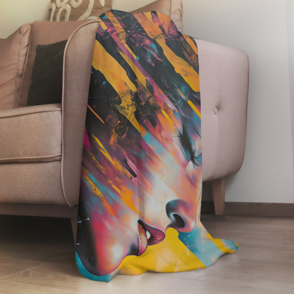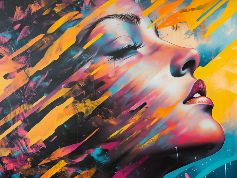 Feeling Colours toont een expressief vrouwenportret dat overspoeld wordt door een explosie van levendige verfstreken in geel, oranje, blauw en roze. Het gezicht lijkt te smelten met de kleuren, waarbij emoties letterlijk zichtbaar worden door de dynamische penseelvoering en de krachtige kleurcontrasten. De abstracte elementen die over het realistische portret heen dansen creƫren een gevoel van innerlijke turbulentie en creativiteit. Dit emotionele kunstwerk brengt de kracht van kleur als uitdrukkingsmiddel prachtig tot uiting.