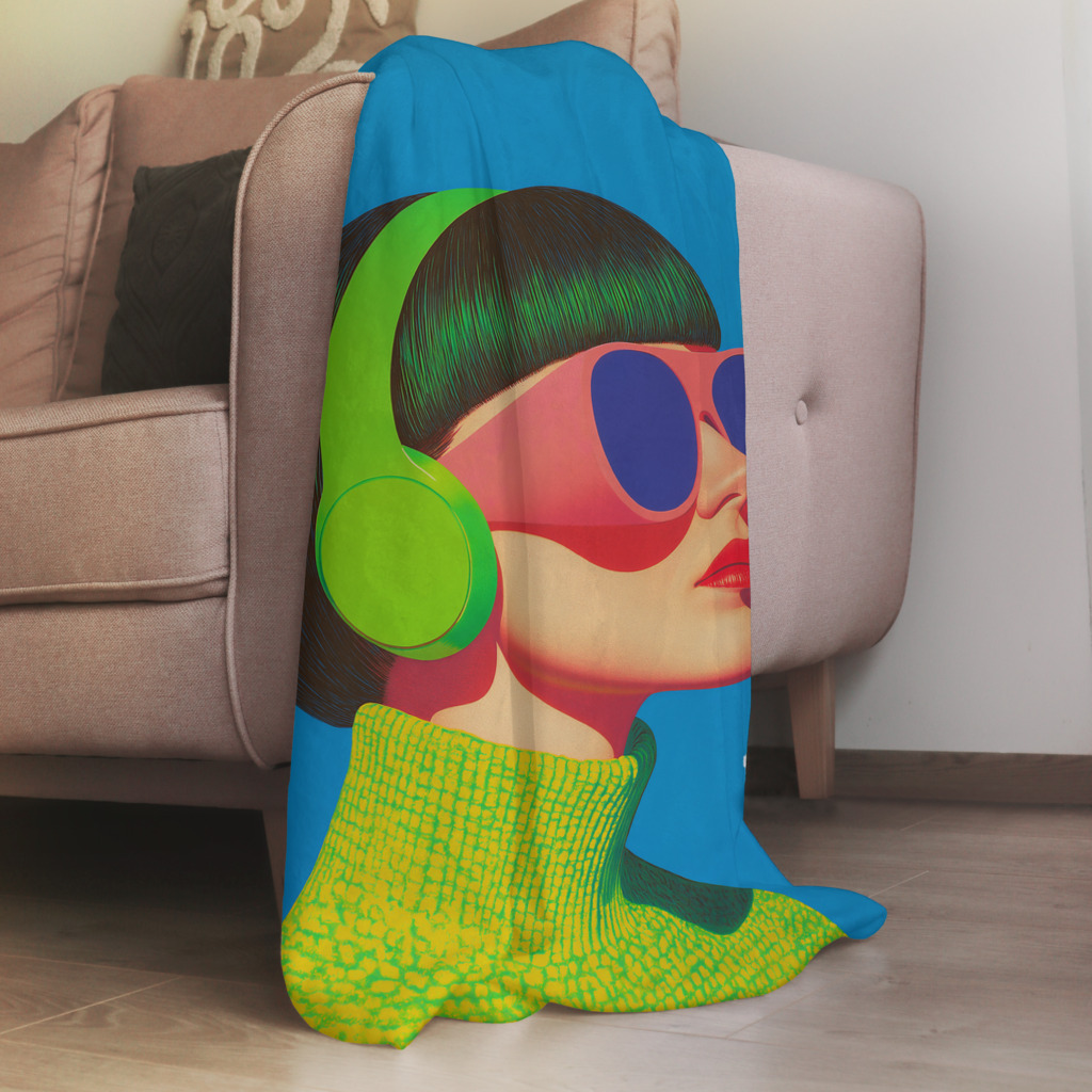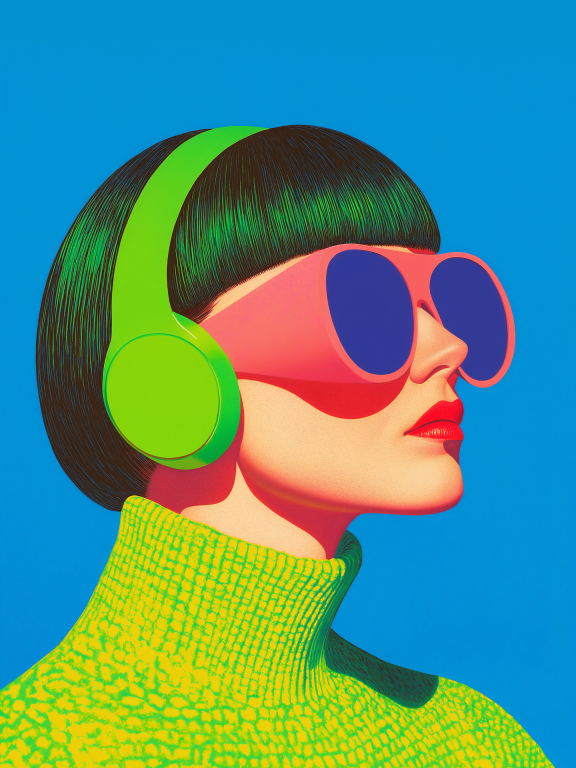Outdoor Introvert toont een stijlvol portret van een moderne vrouw die volledig opgaat in haar eigen wereld, uitgerust met koptelefoon en zonnebril tegen een levendige blauwe achtergrond. De opvallende neon groene en gele accenten van haar kleding en accessoires contrasteren krachtig met de rustige blauwe tinten, wat een gevoel van moderne urban coolness creƫert. De pop art-stijl en de grafische compositie geven het kunstwerk een eigentijdse, trendy uitstraling. Dit contemporary portret belichaamt de moderne digitale levensstijl en brengt een vleugje streetwear esthetiek in je interieur.