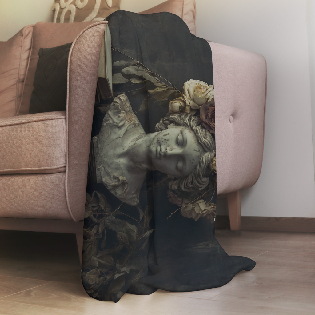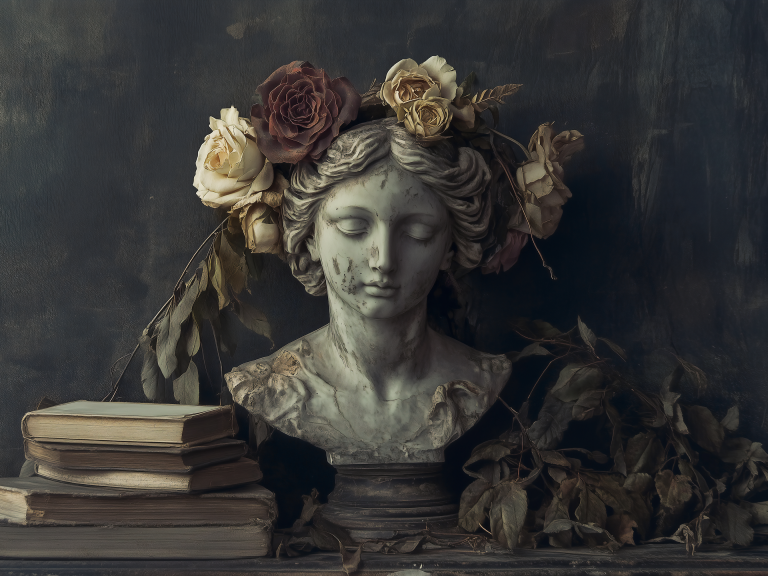 Sleeping Bust is een poëtische meditatie over schoonheid, vergankelijkheid en de tijdloosheid van kunst. Het klassieke sculptuur, gekroond met verwelkende rozen, rust sereen tussen stapels antieke boeken en verdroogd gebladerte. De gesloten ogen van het beeld suggereren een eeuwige droom, terwijl de omringende elementen het verstrijken van de tijd symboliseren. Het ingetogen kleurenpalet van warme sepiatinten versterkt de nostalgische sfeer en roept herinneringen op aan verloren beschavingen en vergeten verhalen. De compositie balanceert tussen leven en stilstand, waarbij de stenen figuur omringd wordt door de vergankelijke schoonheid van de natuur. Dit werk nodigt uit tot contemplatie over de relatie tussen kunst, kennis en het menselijk verlangen naar onsterfelijkheid door creatie.