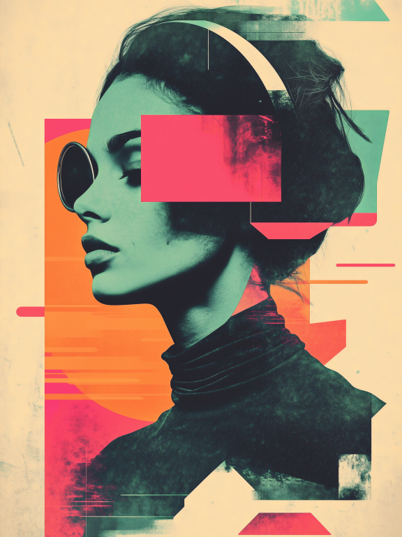 Broken Reality is een modern, abstract kunstwerk dat een vrouwelijke figuur weergeeft in een futuristische, glitch-achtige stijl. De compositie combineert digitale fragmentatie met vintage en cyberpunk-elementen, waarbij levendige kleuren zoals roze en oranje contrasteren met donkere tinten. Het beeld suggereert een samensmelting van technologie en menselijke identiteit, alsof de realiteit versplintert of wordt gemanipuleerd. De geometrische vormen en vervormingen versterken het thema van een gedigitaliseerde wereld waarin perceptie en werkelijkheid niet altijd synchroon lopen.