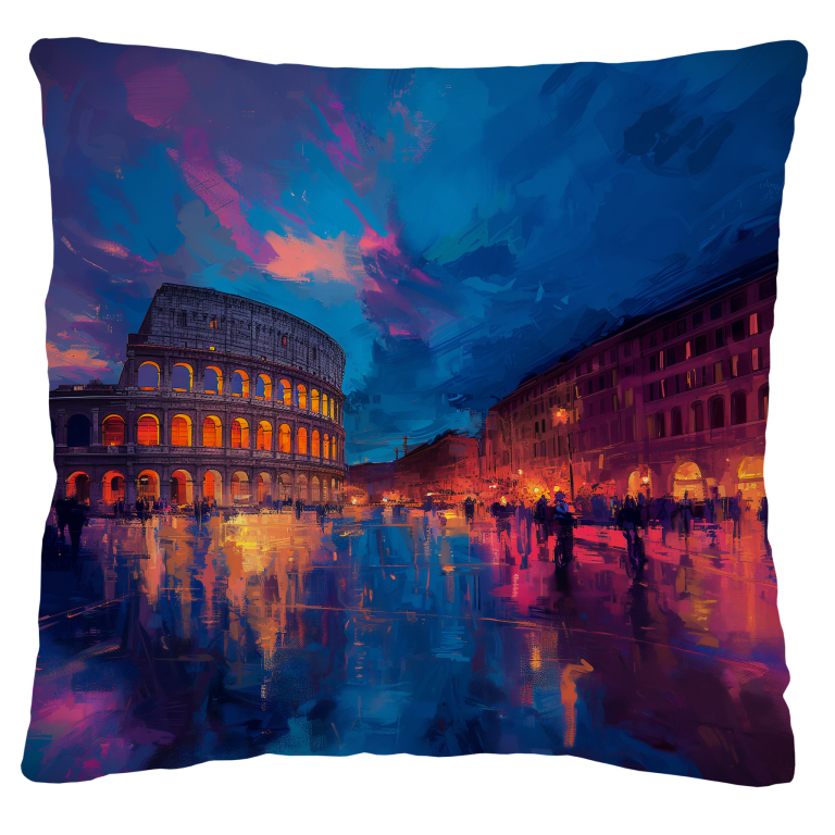 Een sfeervolle, kleurrijke interpretatie van Rome met het iconische Colosseum als middelpunt. De scene speelt zich af tijdens de schemering, waarbij de lucht in diepe blauwtinten overgaat in warme oranje en paarse tinten. De reflecties op de natte straat zorgen voor een levendige gloed, terwijl silhouetten van mensen een dynamisch stadsbeeld creëren. De expressieve penseelstreken en de mix van warme en koele kleuren geven het geheel een moderne, dromerige uitstraling.