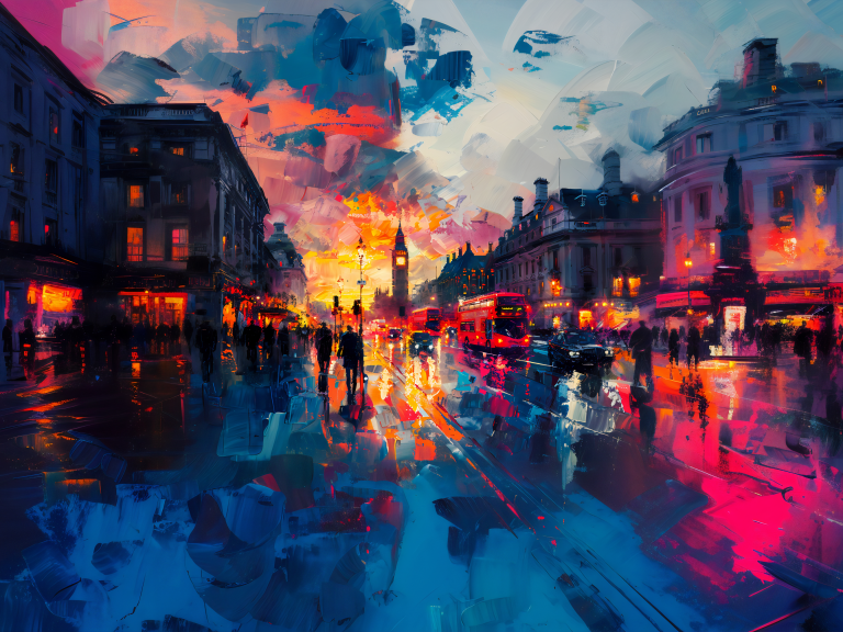 Mornin' London is een levendige, impressionistische weergave van de Londense ochtendspits, waarin een drukke straat tot leven komt met de iconische Big Ben prominent op de achtergrond, badend in een warme zonsopgang. De lucht is een dynamische mix van roze, oranje en blauwe tinten, wat het gevoel van een nieuwe dag perfect weergeeft, terwijl de natgeregende straten de felle lichten van rode dubbeldekkers, autolampen en de gloed van winkelverlichting reflecteren. Donkere silhouetten van voetgangers bewegen haastig door de straat, wat de gejaagde sfeer van de ochtend benadrukt. De grove maar expressieve penseelstreken geven de scène een energieke, bijna tastbare dynamiek, waardoor de bruisende, ontwakende sfeer van Londen krachtig wordt vastgelegd.