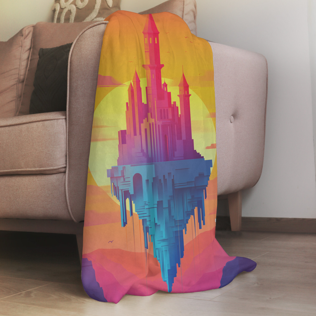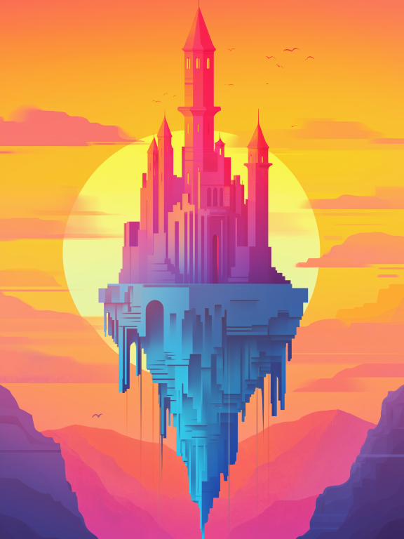 Castle in the Sky toont een magisch drijvend kasteel dat zweeft tussen de wolken in een fantasiewereld vol kleur en mystiek. Het imposante kasteel reflecteert in zijn eigen schaduw, waarbij de warme zonsondergangkleuren van oranje, roze en paars de hele scène in een dromerige gloed hullen. De silhouetten van bergen in de verte en de zachte wolkenformaties creëren een gevoel van oneindige vrijheid en avontuur. Dit betoverende kunstwerk brengt de magie van sprookjes direct in je leefruimte.