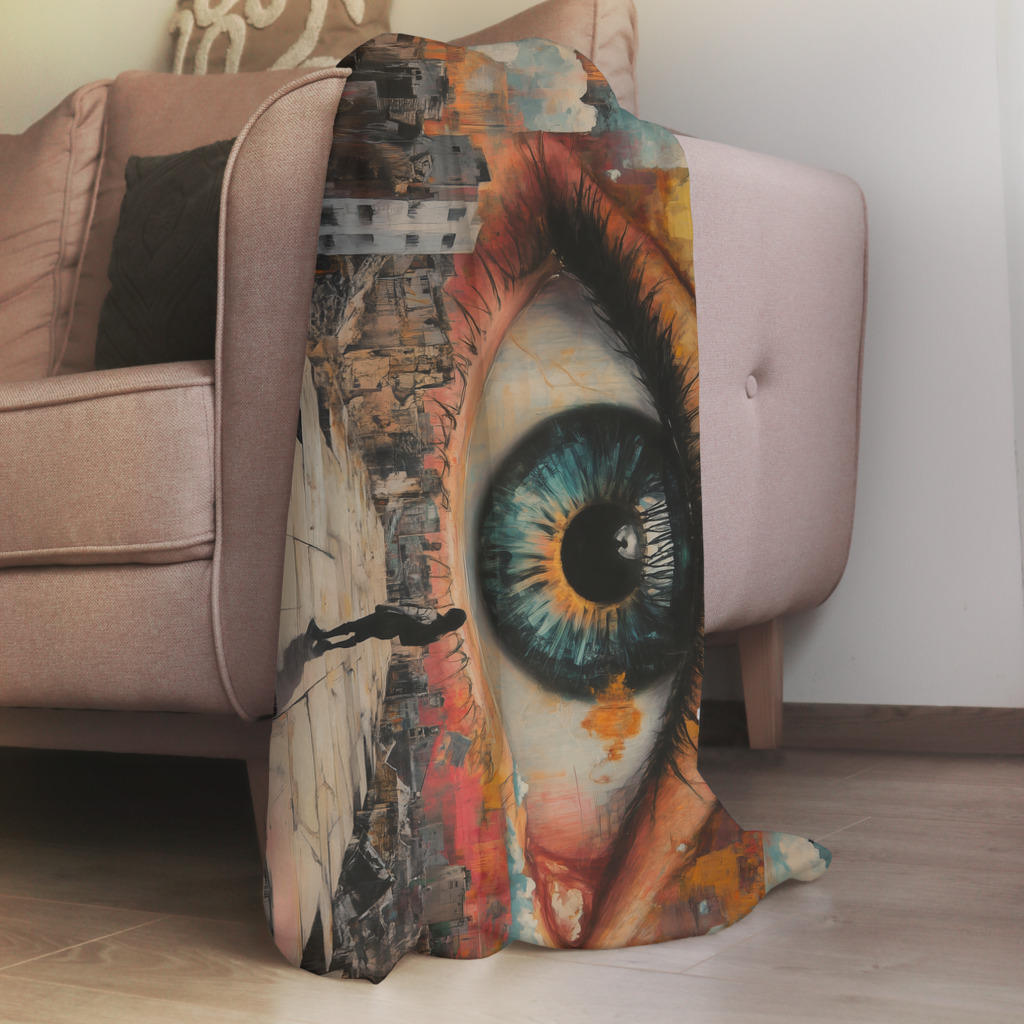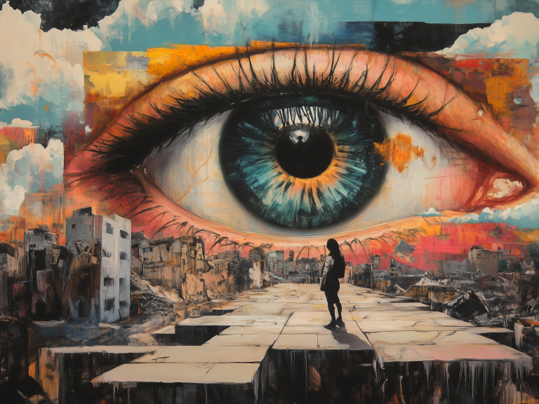 Dit intrigerend design toont een gigantisch oog dat majestueus uitkijkt over een verwoest landschap. Het oog, levendig in kleuren met een intens blauwe iris en goudgele details, symboliseert wellicht bewustzijn of een hogere macht. Op de voorgrond staat een silhouetfiguur op een vervallen pad, wat een gevoel van introspectie en betekenis zoekt in een wereld van chaos. De combinatie van surrealistische en post-apocalyptische elementen creƫert een krachtig visueel verhaal dat uitnodigt tot interpretatie en reflectie.