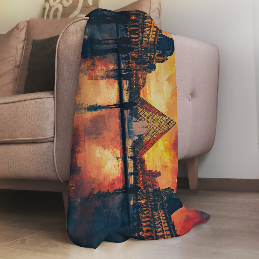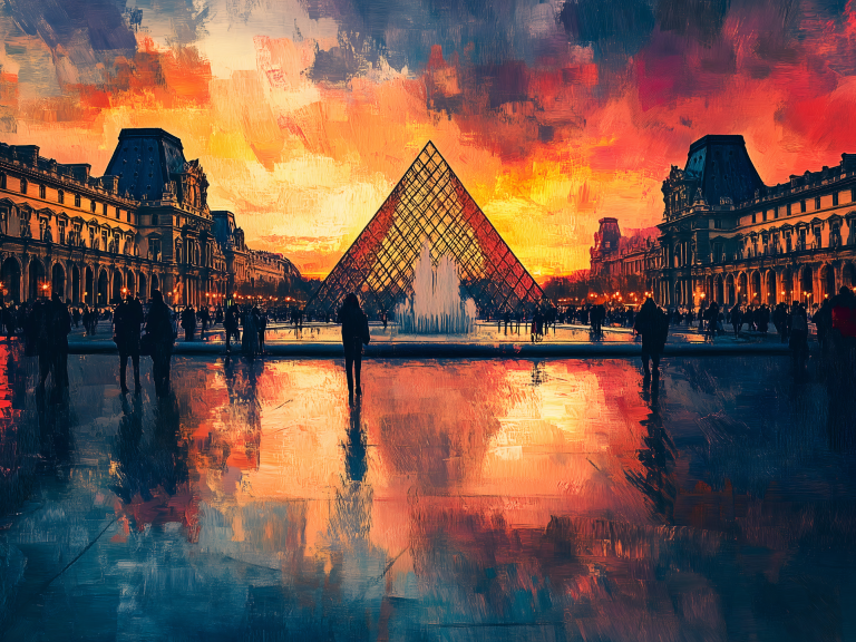 Le Louvre toont het iconische museum gehuld in dramatische zonsondergangkleuren die de Parijse hemel in vuur en vlam zetten. De glazen piramide weerspiegelt de warme oranje en rode tinten terwijl silhouetten van bezoekers over het natte plein wandelen. Deze impressionistische interpretatie vangt de tijdloze grandeur van een van 's werelds beroemdste culturele monumenten. Perfect voor liefhebbers van Parijs, architectuur en kunstgeschiedenis die verlangen naar een vleugje Franse elegantie.