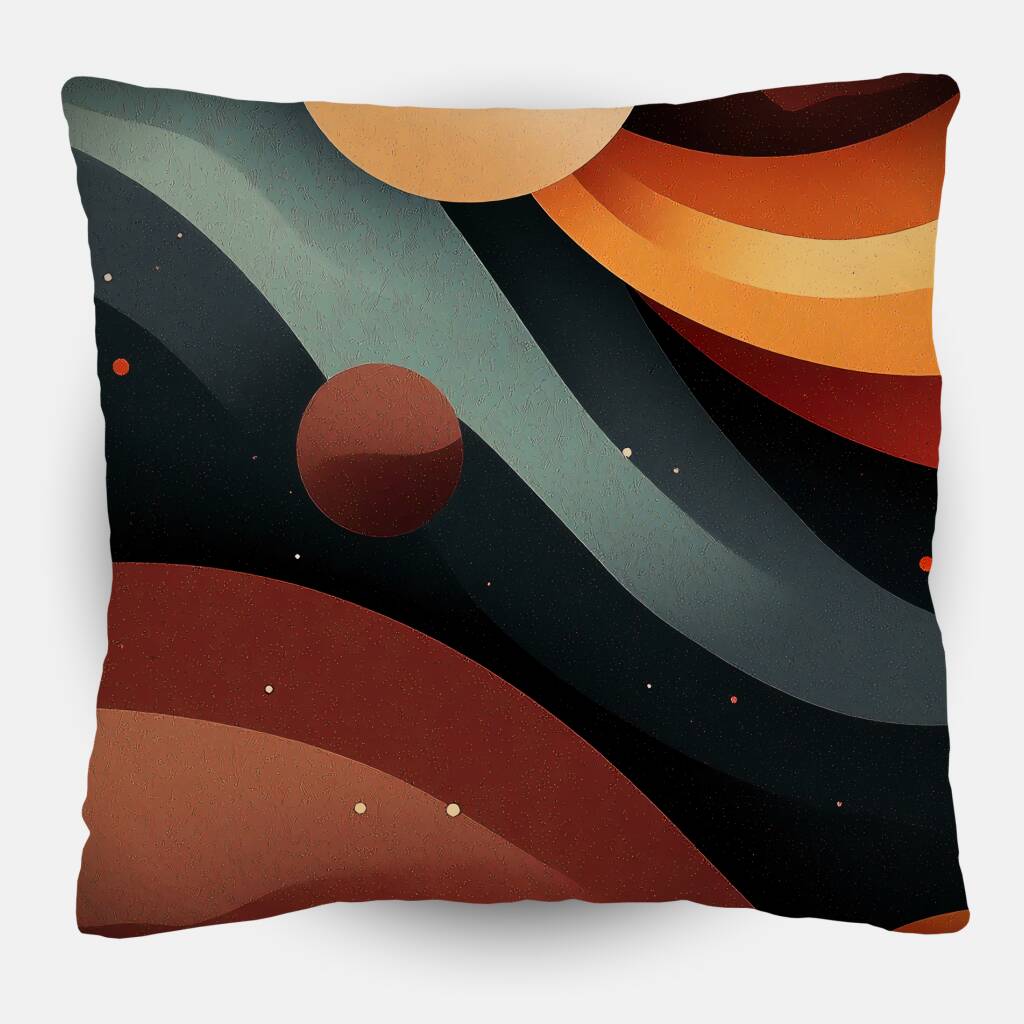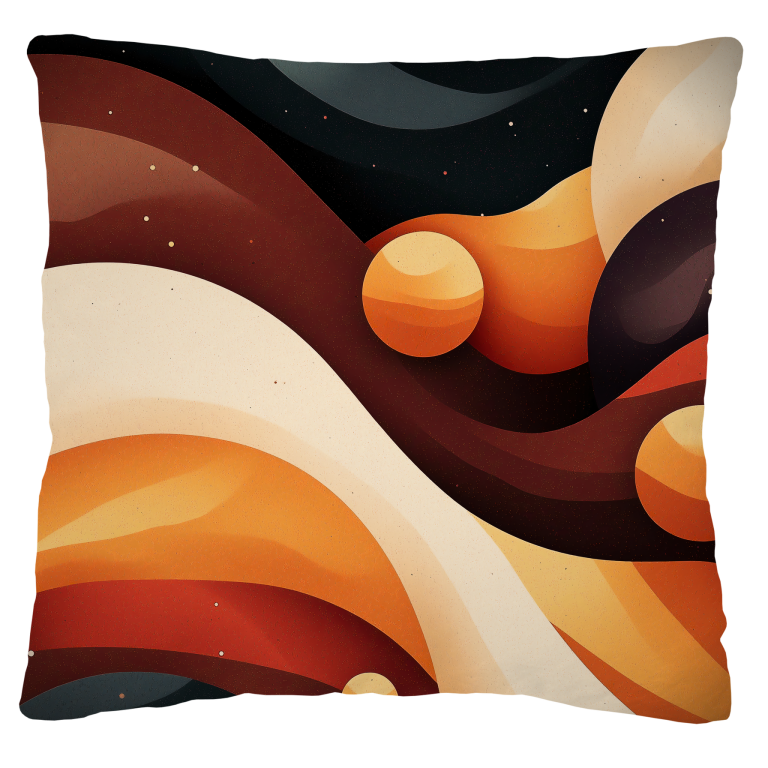 Een betoverend spel van golvende lijnen en kosmische vormen in warme aardetinten en diepe nachtblauwe accenten. De compositie geeft een ruimtelijk gevoel, alsof je door een abstracte, buitenaardse dimensie zweeft. De harmonie tussen kleur en vorm creëert een dromerige uitstraling, waarbij planeten en golvende structuren in een mystiek samenspel lijken te dansen.