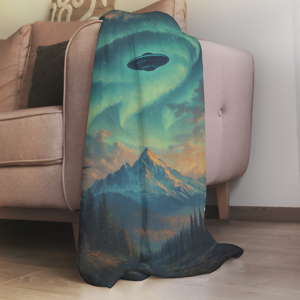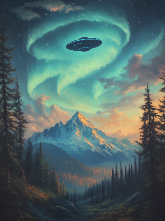 We are out There toont een mysterieus UFO dat zweeft boven een majestueus berglandschap, omringd door spectaculaire groene noorderlichtstralen die de nachtelijke hemel verlichten. Het contrast tussen de serene natuurlijke schoonheid en het buitenaardse fenomeen creƫert een fascinerende spanning tussen bekend en onbekend. Dit betoverende sci-fi landschap prikkelt de verbeelding en nodigt uit tot dromen over de oneindige mogelijkheden van het universum. Perfect voor liefhebbers van mysterie en kosmische avonturen.