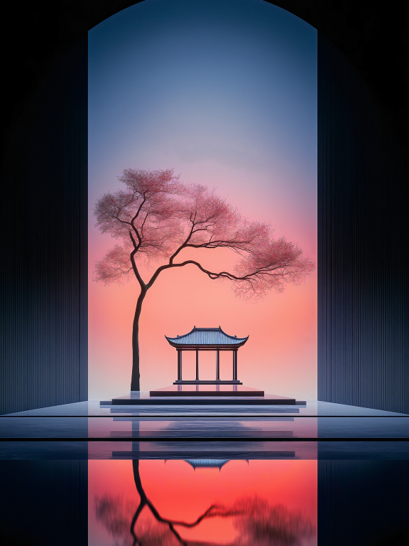 Staged China presenteert een serene compositie waarin Oosterse architectuur en natuur samensmelten in perfecte harmonie. Een elegante pagode rust op een verhoogd platform, omlijst door een sierlijke boom die zich uitstrekt tegen een dromerige schemering. De zachte gradiƫnt van diep blauw naar warm roze in de lucht weerspiegelt zich in het stille water beneden, waardoor een gevoel van oneindige rust ontstaat. De minimalistische benadering benadrukt de essentiƫle elementen van contemplatie en balans die centraal staan in de Aziatische filosofie. Dit kunstwerk nodigt uit tot innerlijke reflectie en brengt de tijdloze schoonheid van het Verre Oosten naar uw ruimte. Een meditatief meesterwerk dat rust en verfijning uitstraalt.