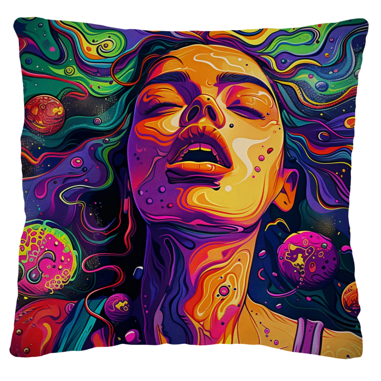 Trippy is een psychedelisch kunstwerk dat een vrouw toont met een extatische gezichtsuitdrukking, omgeven door een kleurrijk, golvend universum. Haar huid en haar smelten samen met surrealistische patronen in neonkleuren, terwijl zwevende planeten en energiegolven een dromerige, kosmische sfeer creëren. De dynamische compositie en levendige tinten wekken een gevoel van bewustzijnsverruiming en vrijheid op, alsof ze zich volledig overgeeft aan een transcendente ervaring.