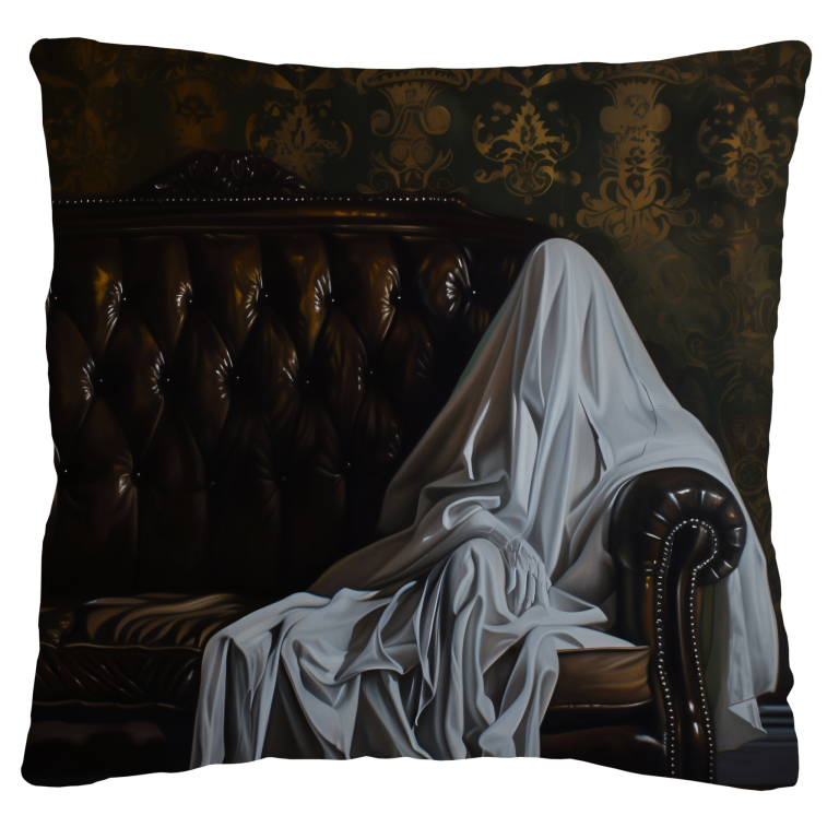 Never Alone presenteert een mysterieuze en intrigerende scène waarin een figuur gehuld in witte stof rust op een klassieke leren chesterfield bank in een statige victorionale kamer. De donkere, rijke achtergrond met zijn ornamentele behang contrasteert dramatisch met de lichte, etherische verschijning van de figuur. De sfeer roept vragen op over identiteit, eenzaamheid en aanwezigheid, terwijl de elegante inrichting een tijdloos gevoel van mystiek uitstraalt. Dit thought-provoking kunstwerk nodigt uit tot contemplatie en brengt een element van artistiek mysterie in je interieur.