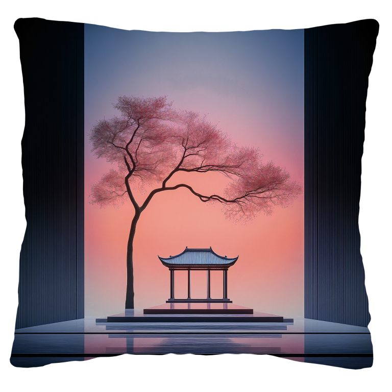 Staged China presenteert een serene compositie waarin Oosterse architectuur en natuur samensmelten in perfecte harmonie. Een elegante pagode rust op een verhoogd platform, omlijst door een sierlijke boom die zich uitstrekt tegen een dromerige schemering. De zachte gradiënt van diep blauw naar warm roze in de lucht weerspiegelt zich in het stille water beneden, waardoor een gevoel van oneindige rust ontstaat. De minimalistische benadering benadrukt de essentiële elementen van contemplatie en balans die centraal staan in de Aziatische filosofie. Dit kunstwerk nodigt uit tot innerlijke reflectie en brengt de tijdloze schoonheid van het Verre Oosten naar uw ruimte. Een meditatief meesterwerk dat rust en verfijning uitstraalt.