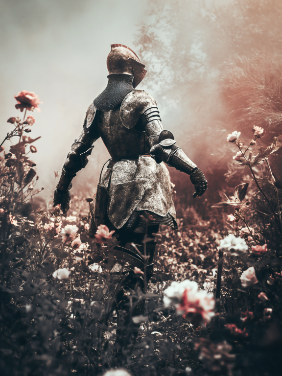 Female Knight toont een machtige krijgsvrouw in volledig metalen harnas die statig door een dromerig bloemenveld wandelt. De contrasten tussen de harde, koude wapenrusting en de zachte, delicate bloemen creëren een poëtische spanning tussen kracht en kwetsbaarheid. De warme, mistige atmosfeer en de vintage kleurenpalet geven het kunstwerk een romantische, nostalgische uitstraling die de tijdloze mythe van ridderschap en moed belichaamt. Dit krachtige symbool van vrouwelijke sterkte en gratie brengt inspiratie en elegantie in elke ruimte.