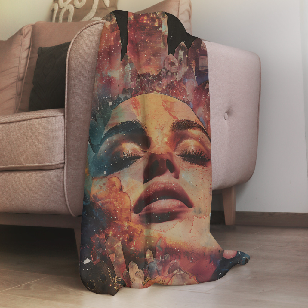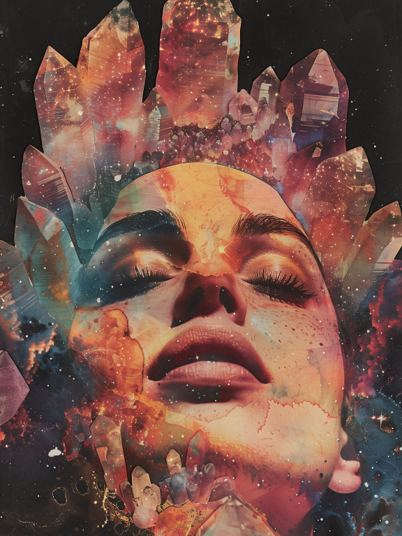 Crystal Meth presenteert een surrealistische fusie waarbij een sereen vrouwengezicht wordt omgeven door een krans van kristalachtige formaties. De schitterende mineralen lijken uit haar hoofd te groeien, waarbij warme kopertinten en koele blauwe nuances elkaar ontmoeten in een kosmische dans van texturen. De vredige uitdrukking contrasteert met de complexe geologische structuren, wat resulteert in een mystieke en contemplatieve sfeer. Dit intrigerende kunstwerk nodigt uit tot reflectie over de verbinding tussen mens en natuur.
