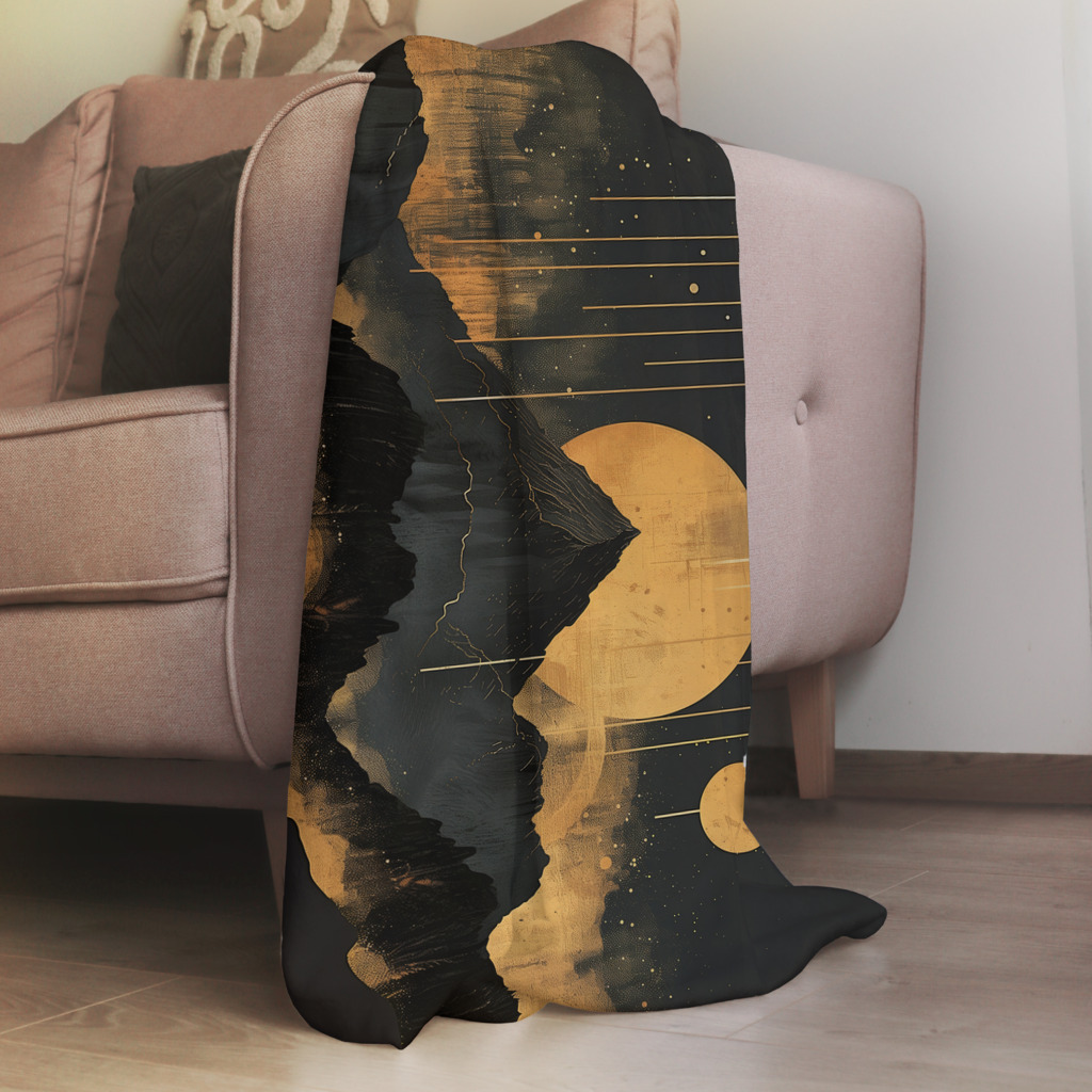 Golden Mountain presenteert een mystiek berglandschap waar gouden lichtstralen als kosmische regen neerdalen op donkere bergtoppen. De warme gouden accenten tegen de diepe zwarte achtergrond creƫren een hypnotiserend contrast dat zowel aards als buitenaards aanvoelt. Dit contemplatieve kunstwerk straalt spirituele kracht en natuurlijke majesteit uit. Perfect voor wie houdt van minimalistische landschappen met een vleugje mystiek en de symboliek van goud als verlichting waardeert.