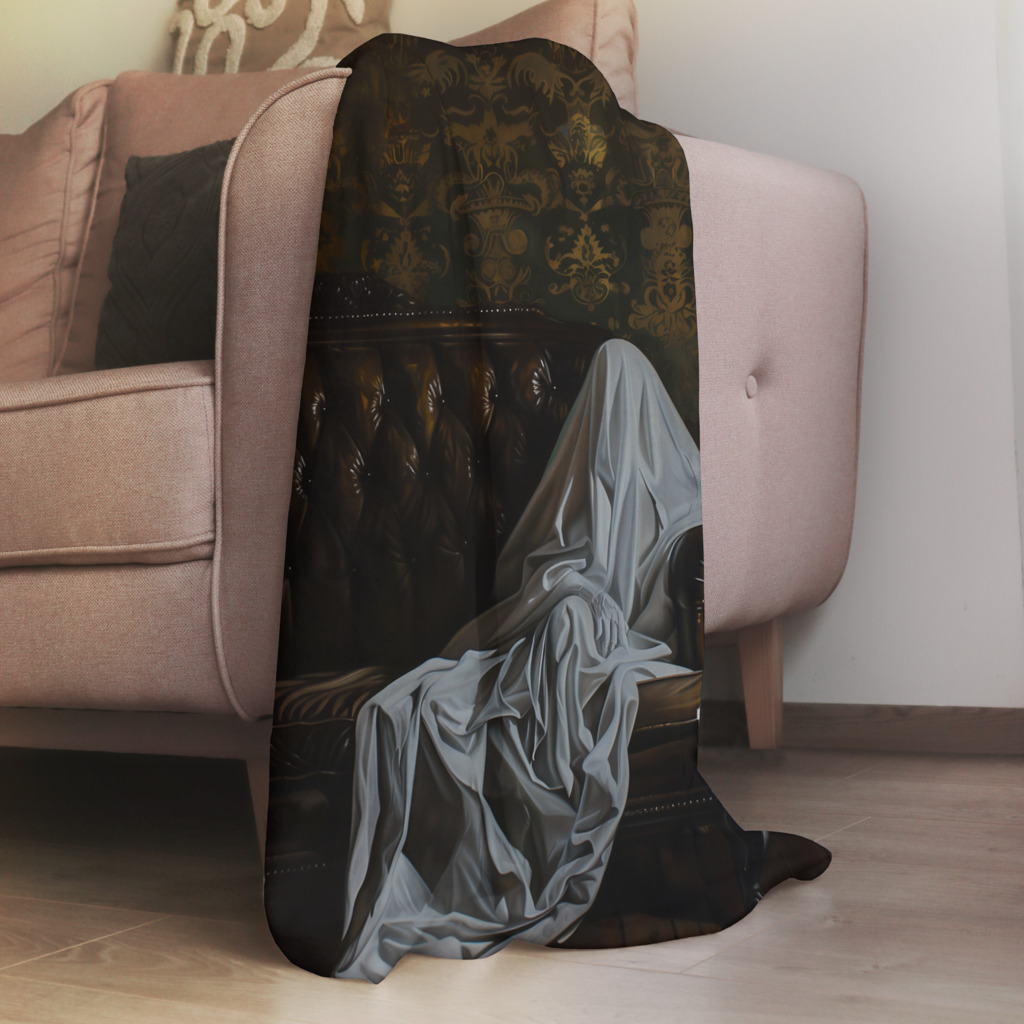 Never Alone presenteert een mysterieuze en intrigerende scène waarin een figuur gehuld in witte stof rust op een klassieke leren chesterfield bank in een statige victorionale kamer. De donkere, rijke achtergrond met zijn ornamentele behang contrasteert dramatisch met de lichte, etherische verschijning van de figuur. De sfeer roept vragen op over identiteit, eenzaamheid en aanwezigheid, terwijl de elegante inrichting een tijdloos gevoel van mystiek uitstraalt. Dit thought-provoking kunstwerk nodigt uit tot contemplatie en brengt een element van artistiek mysterie in je interieur.