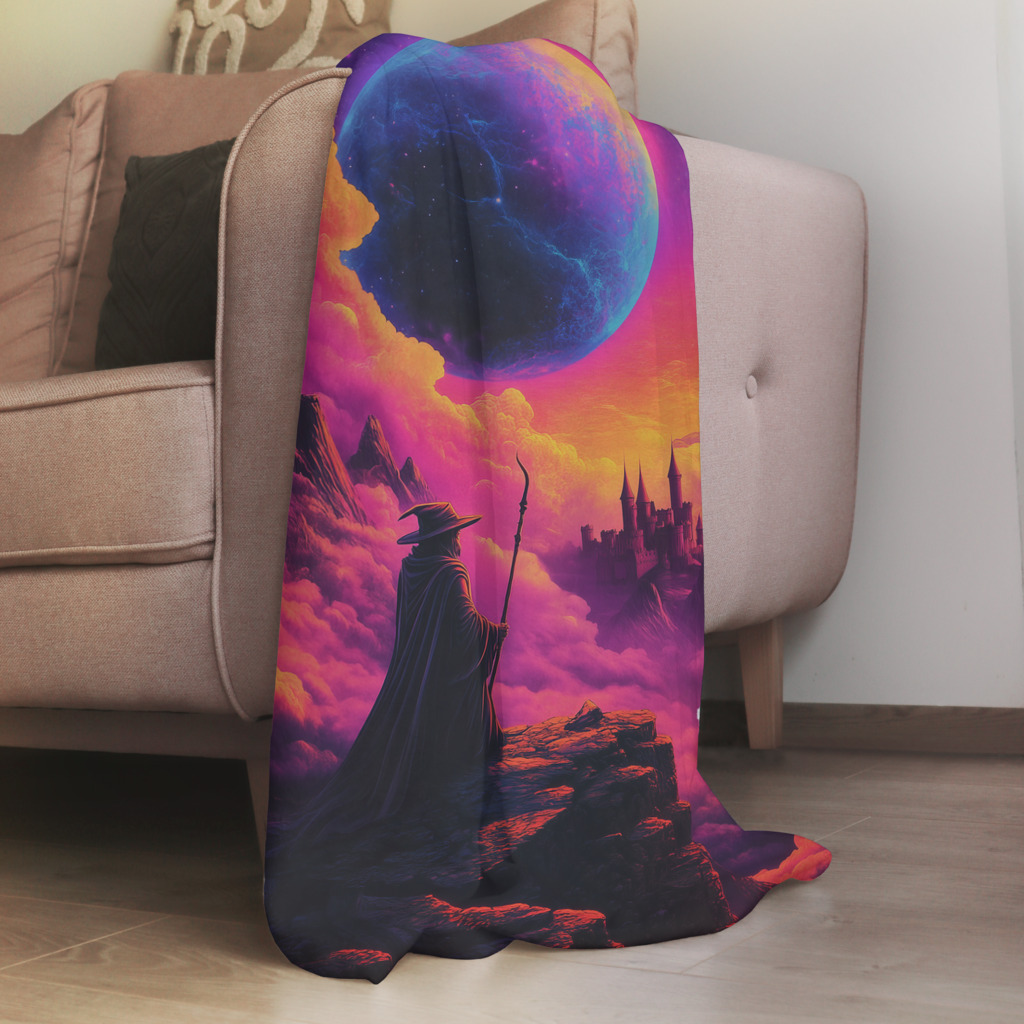 Neon Wizard opent een poort naar een magische wereld waar een mysterieuze tovenaar waakt over een kosmisch landschap. De neon-kleuren van roze, paars en oranje creƫren een hypnotiserende atmosfeer, terwijl een gigantische planeet dreigend boven het fantasielandschap hangt. Het kasteel in de verte belooft verhalen van oude magie en avontuur. Dit betoverende kunstwerk brengt de wonderen van science fiction en fantasy samen in een spectaculair visueel feest voor elke ruimte.