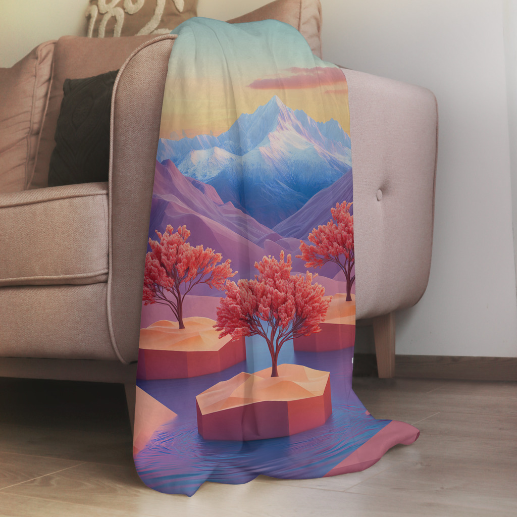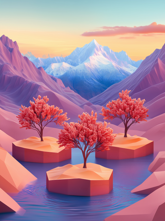 Three Trees toont een surrealistisch berglandschap waar drie prachtige koraalkleurige bomen groeien op geometrische eilandjes in kristalhelder water. De pastelkleuren van roze, blauw en oranje creƫren een dromerige atmosfeer waarin natuurlijke schoonheid en abstracte vormgeving samenkomen. Dit fantasierijke landschap straalt sereniteit en creativiteit uit, perfect voor moderne interieurs die verlangen naar een vleugje magie. Een inspirerend kunstwerk dat de verbeelding prikkelt en elke ruimte transformeert.