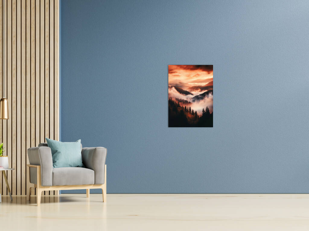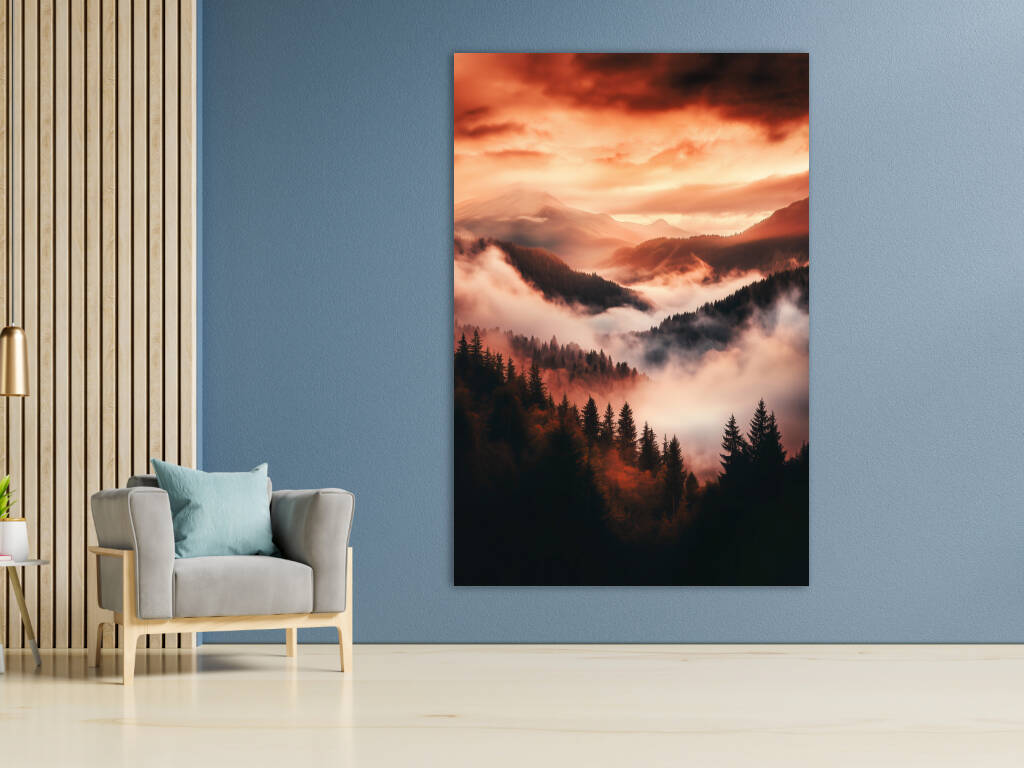 Misty Mountain onthult een adembenemend berglandschap gehuld in mysterieuze nevels en het warme licht van de gouden uurtjes. De dramatische oranje hemel contrasteert prachtig met de zachte mistsluiers die door de valleien dansen, terwijl donkere dennenbomen als wachters op de voorgrond staan. Dit sfeervolle landschap straalt rust en grootsheid uit, een ode aan de ongetemde schoonheid van de natuur. Perfect voor wie verlangt naar de sereniteit van berglandschappen en de magie van het gouden uur.