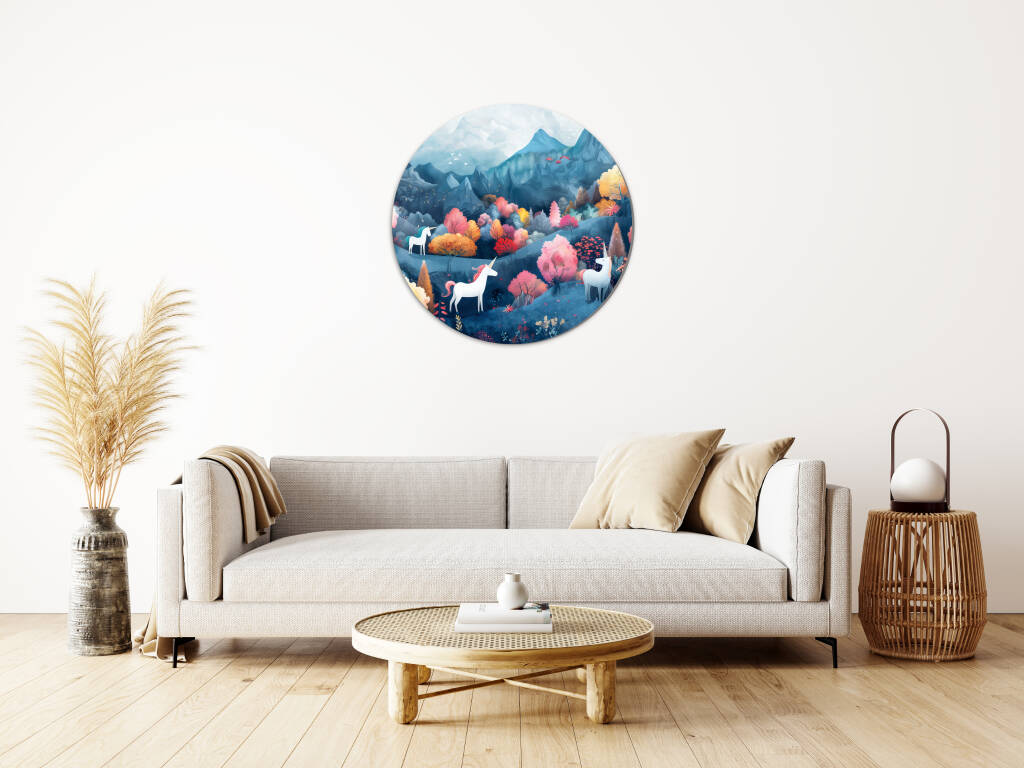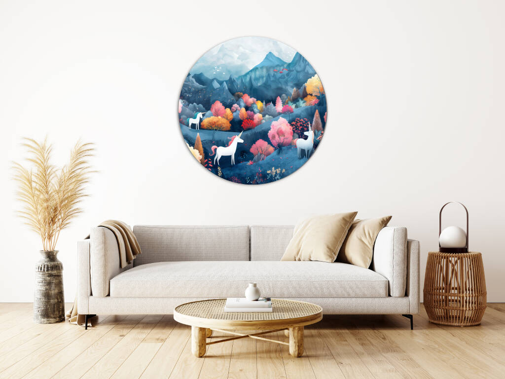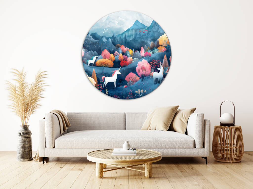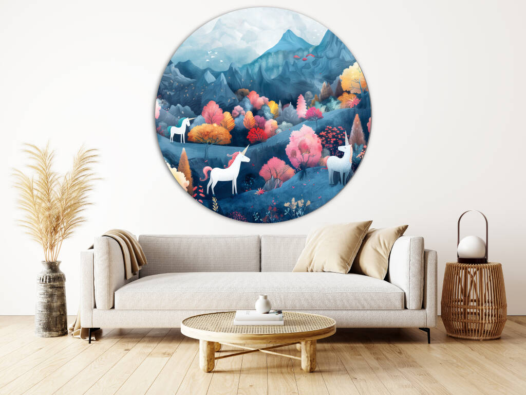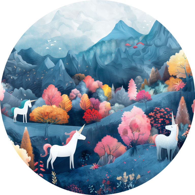 Unicorn Paradise is een betoverend tafereel dat je meeneemt naar een sprookjesachtige wereld, verborgen in de rustige heuvels van een mystiek landschap. De lucht is zacht en dromerig, met bergen die in de verte oprijzen en gehuld zijn in een lichte, magische mist. De heuvels zijn versierd met bomen in warme tinten van roze, geel en rood, wat een prachtig contrast vormt met de koele blauwe ondergrond. Te midden van deze kleurrijke oase dwalen majestueuze witte eenhoorns rond, hun manen zachtjes golvend in pastelkleuren. Hun hoorns glinsteren subtiel in het licht, alsof ze zelf een bron van magie zijn. De hele scène straalt rust en verwondering uit, alsof je een verborgen paradijs hebt ontdekt waar alleen de puurste dromen tot leven komen.