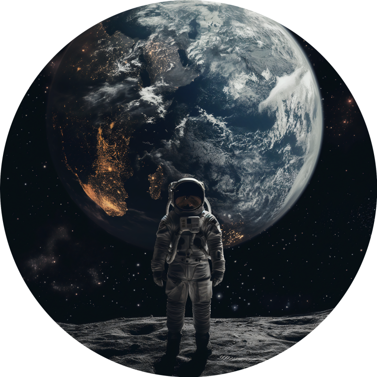 No Limit toont een eenzame astronaut die op het maanoppervlak staat en opkijkt naar de machtige aarde die boven hem hangt in de oneindige ruimte. De indrukwekkende planeet domineert de kosmische scène met zijn blauwe oceanen en witte wolkenformaties, terwijl sterren als diamanten schitteren in de diepe zwarte ruimte. De kleine menselijke figuur symboliseert moed, ontdekking en de grenzeloze mogelijkheden van de menselijke geest. Dit inspirerende kunstwerk brengt de grandeur van ruimteverkenning en onze plaats in het universum prachtig tot uiting.