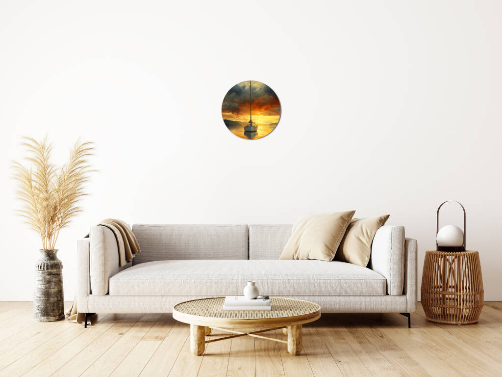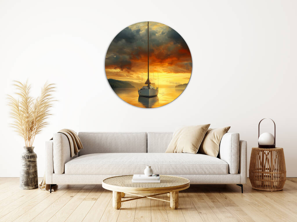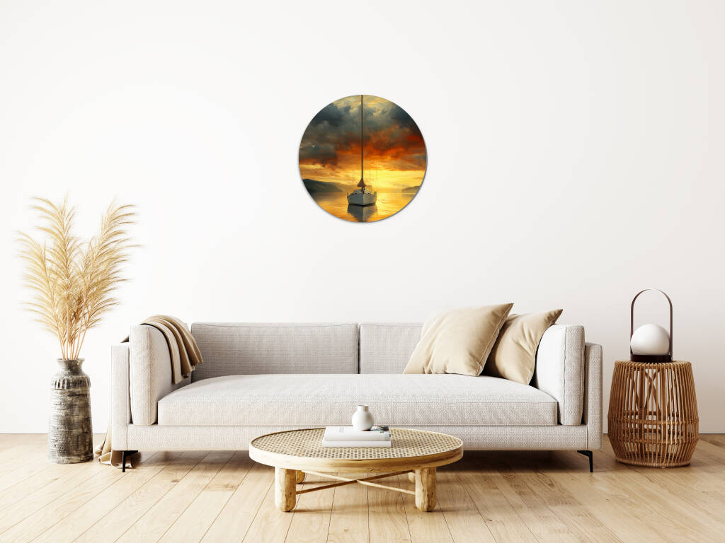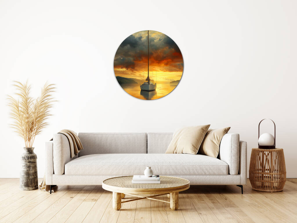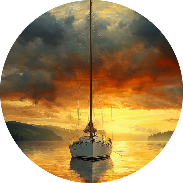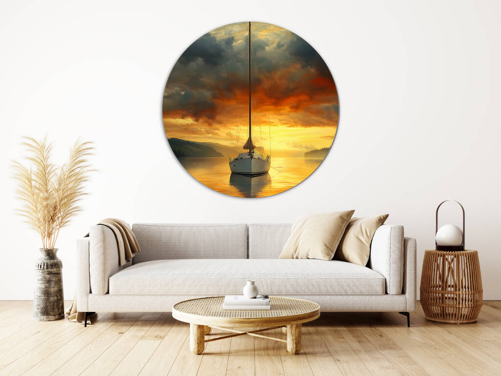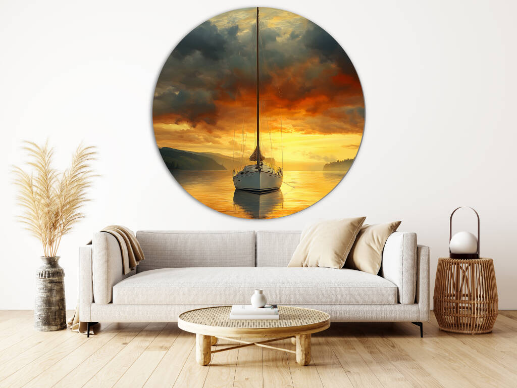 Freedom toont een eenzame zeilboot die rust op spiegelglad water tijdens een adembenemende zonsondergang. De warme gouden en oranje tinten van de hemel reflecteren perfect in het kalme water, terwijl dramatische wolken het tafereel omlijsten. Dit serene beeld symboliseert vrijheid, avontuur en de oneindige mogelijkheden die de horizon biedt. Perfect voor dromerige zielen die verlangen naar rust, reflectie en het gevoel van grenzeloze vrijheid op het water.