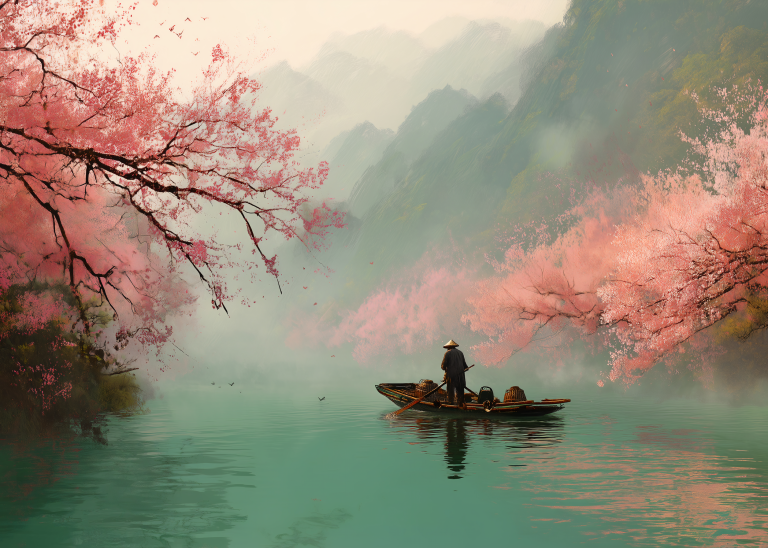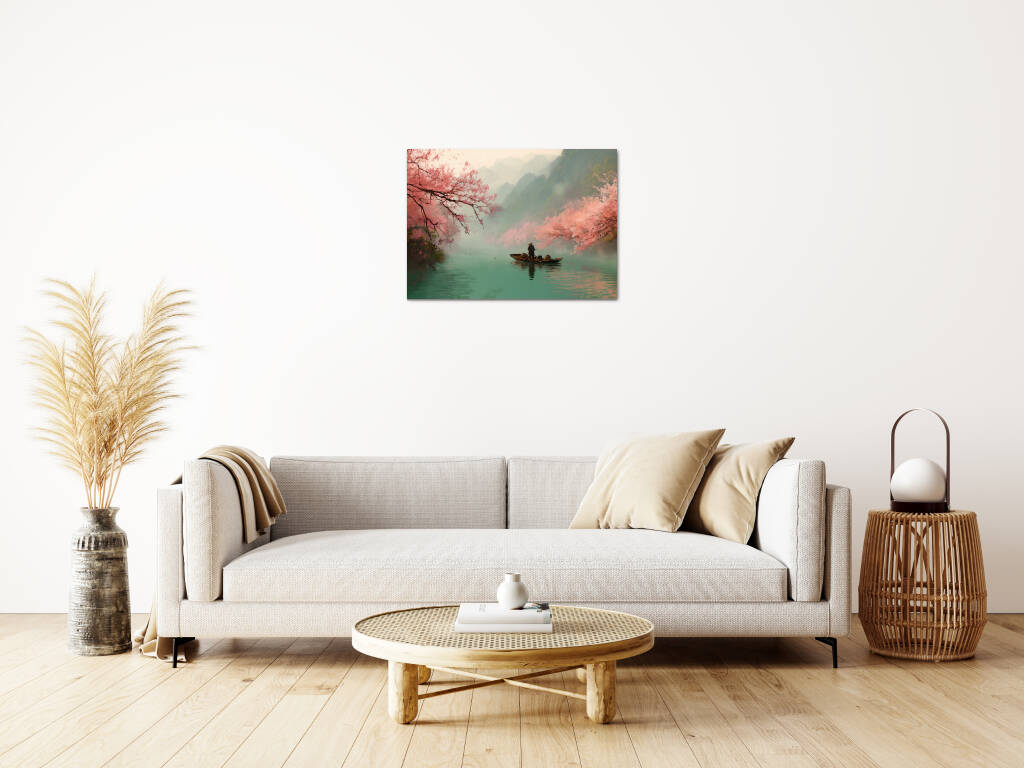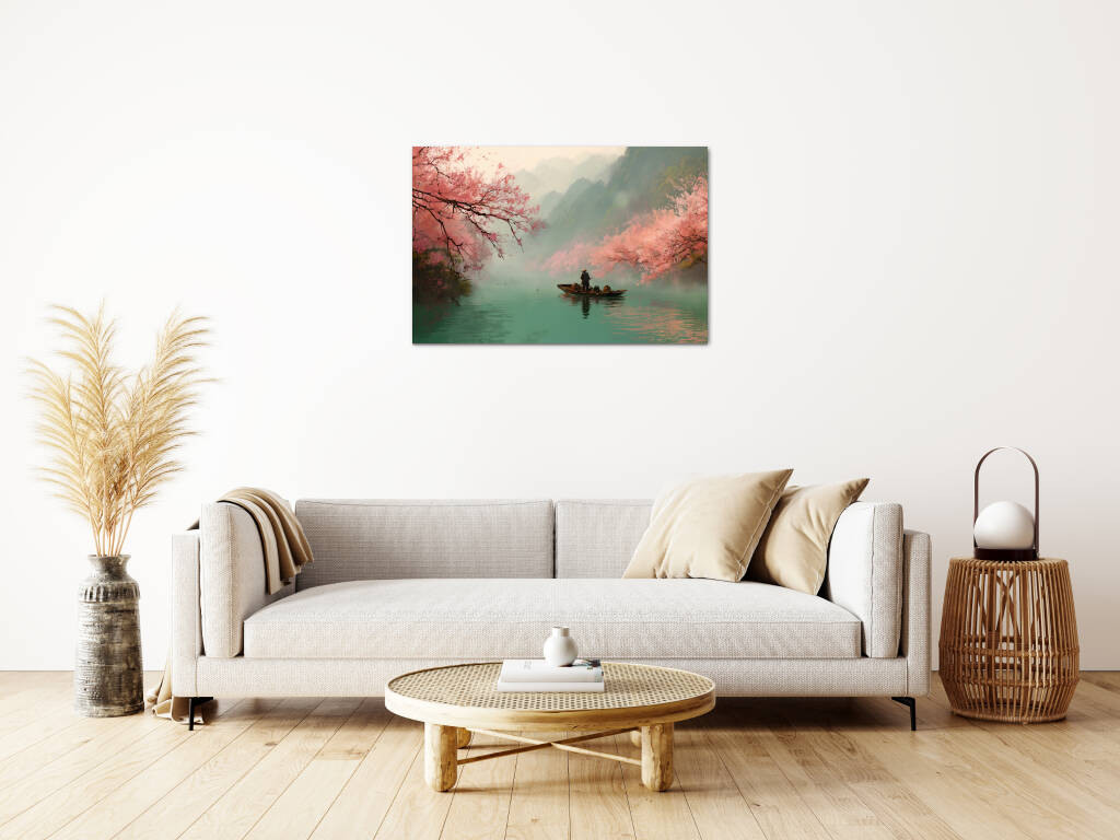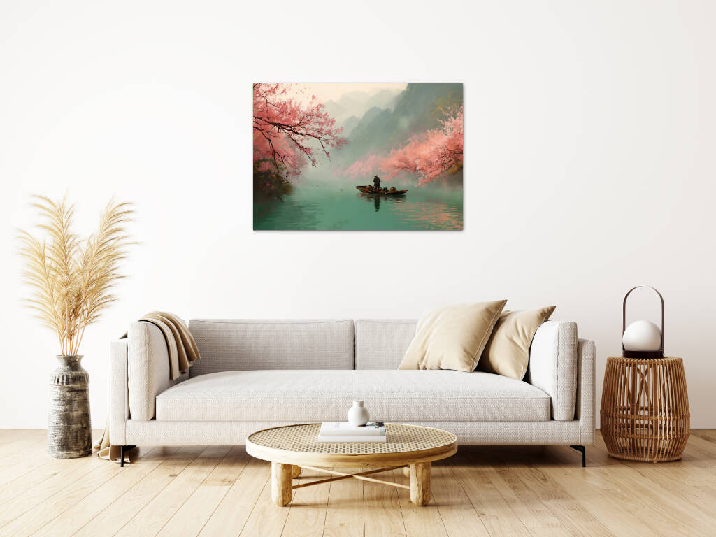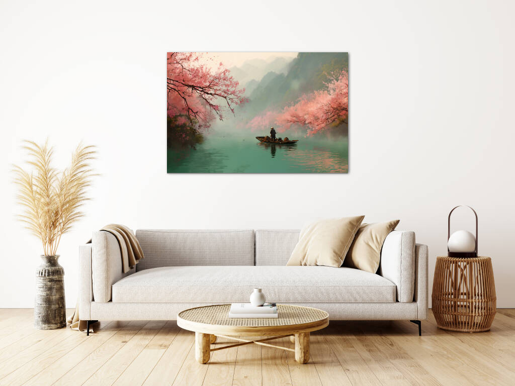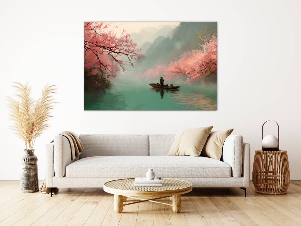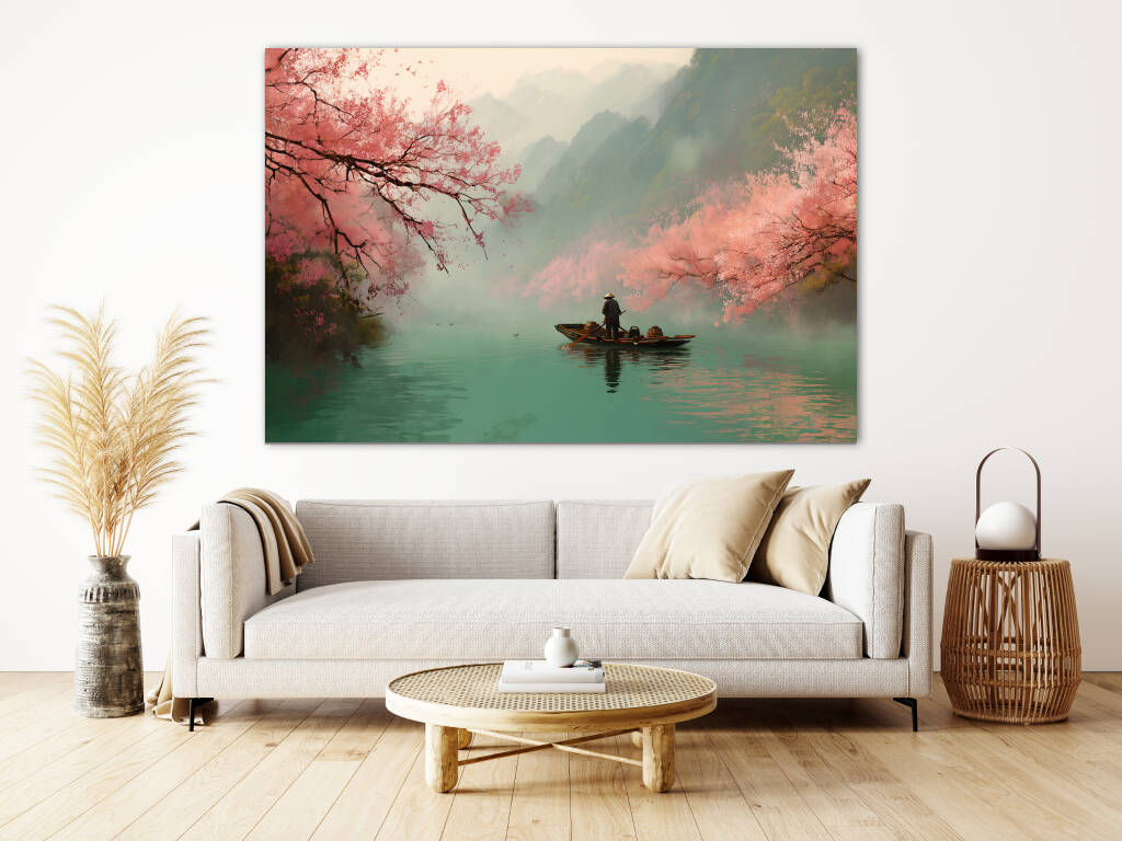 Blossom Fisherman toont een serene scène waarin een visser zijn weg vindt door een meer omgeven door roze kersenbloesems. De zachte pastelkleuren van de bloeiende bomen contrasteren prachtig met het kalme, groene water en de mystieke nevelsluiers die tussen de bergen hangen. De eenzame figuur in zijn boot symboliseert rust en contemplatie te midden van de natuurlijke schoonheid. Dit poetische kunstwerk brengt de vredige sfeer van de Japanse lente rechtstreeks in je interieur.