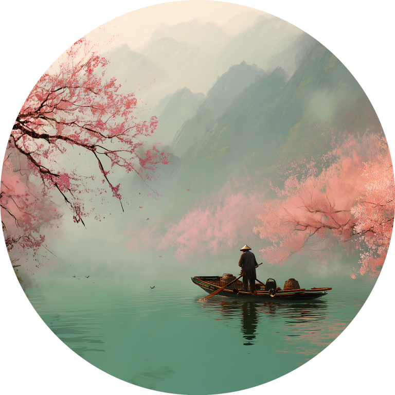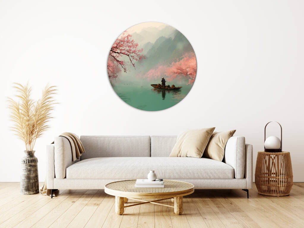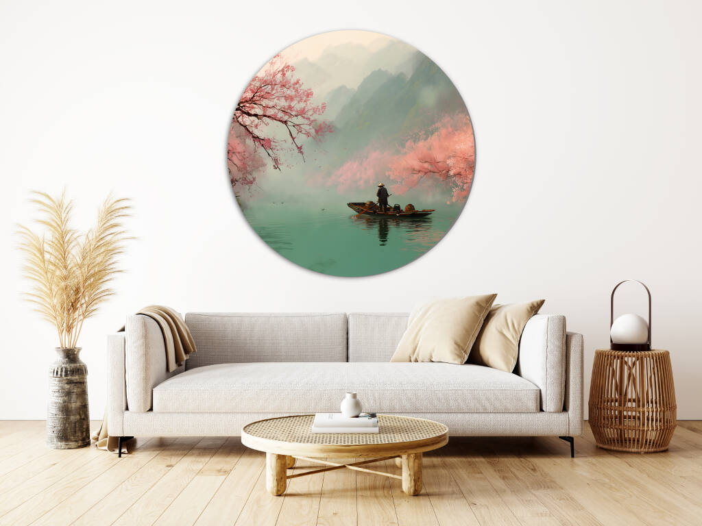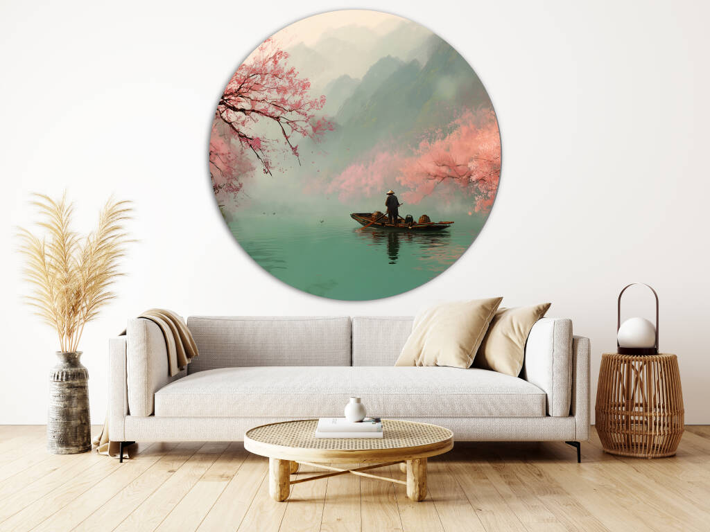 Blossom Fisherman toont een serene scène waarin een visser zijn weg vindt door een meer omgeven door roze kersenbloesems. De zachte pastelkleuren van de bloeiende bomen contrasteren prachtig met het kalme, groene water en de mystieke nevelsluiers die tussen de bergen hangen. De eenzame figuur in zijn boot symboliseert rust en contemplatie te midden van de natuurlijke schoonheid. Dit poetische kunstwerk brengt de vredige sfeer van de Japanse lente rechtstreeks in je interieur.