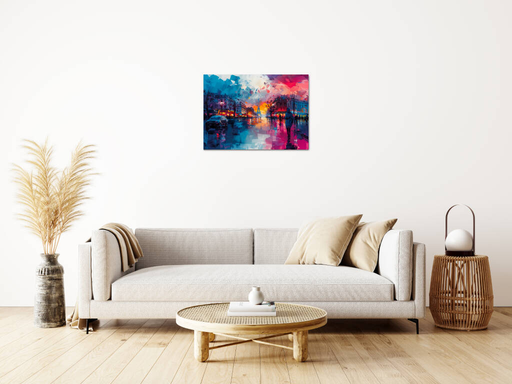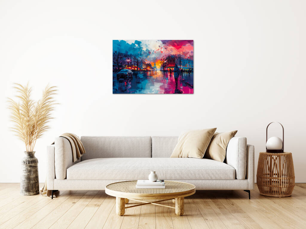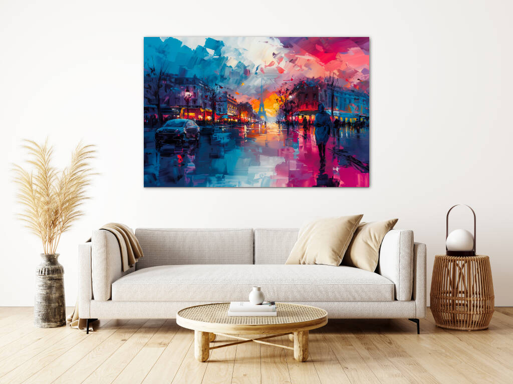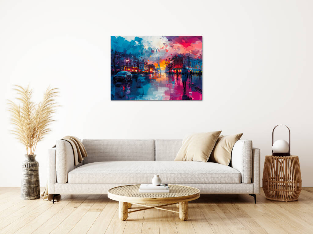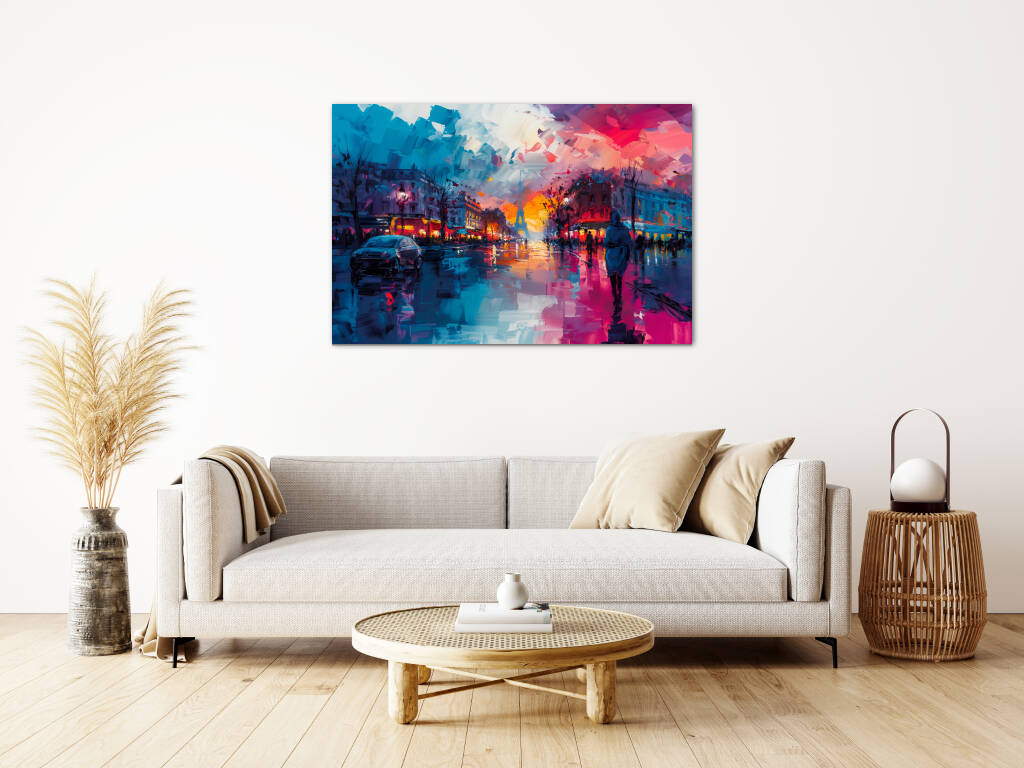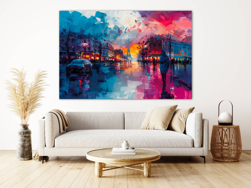 Bonjour Paris is een dynamisch en kleurrijk stadsgezicht van Parijs bij zonsopgang. De schilderachtige stijl, met dikke, expressieve penseelstreken, vangt de levendige energie van de stad. De lucht is een dramatische mix van warme roze en oranje tinten die overgaan in koel blauw, wat de sfeer tussen nacht en dag perfect weergeeft. Op de voorgrond loopt een silhouet van een persoon, gehuld in een jas, richting de iconische Eiffeltoren die in de verte oprijst, gehuld in mistige gloed. De natte straten reflecteren de neonlichten van cafés en winkels, wat de scène een dromerige, romantische uitstraling geeft. Het geheel straalt de magie van een Parijse ochtendwandeling uit - een mix van modern stadsleven en klassieke charme.