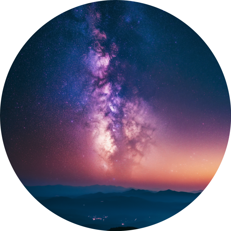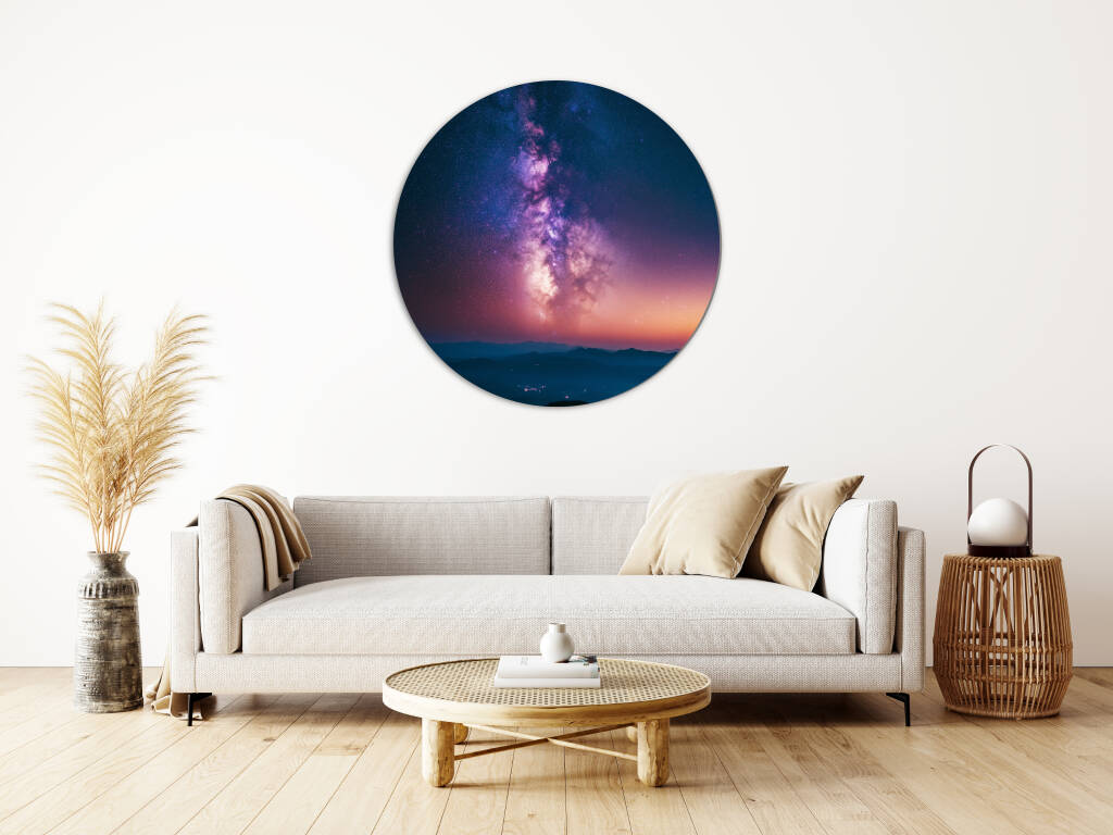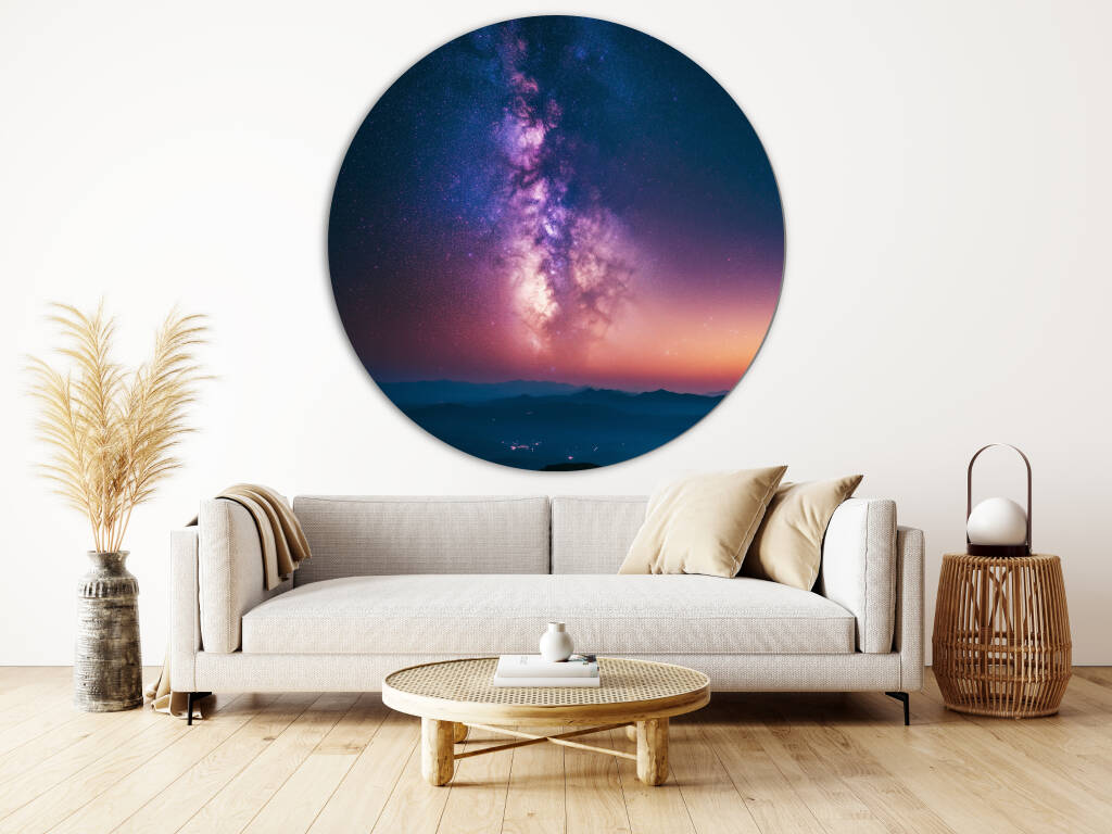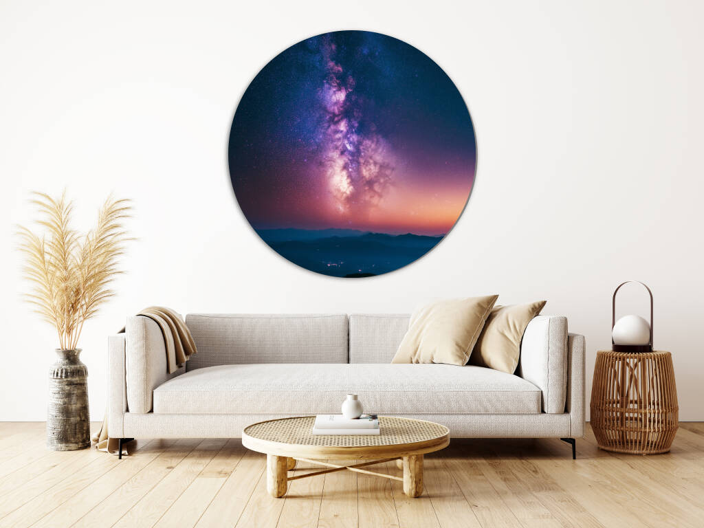 Milky Way toont een adembenemend nachtlandschap waarin de galactische kern van onze melkweg zich in al zijn pracht ontvouwt boven een serene bergenreeks. De warme paarse en roze tinten van de sterrennevels contrasteren prachtig met het koele blauw van de schemering, terwijl miljoenen sterren als diamanten fonkelen in de kosmische dans. De vredige aardse landschap vormt een perfecte tegenhanger tot de grandeur van het universum erboven. Dit inspirerende kunstwerk brengt de oneindige schoonheid van de kosmos en ons plaats daarin direct in je leefruimte.