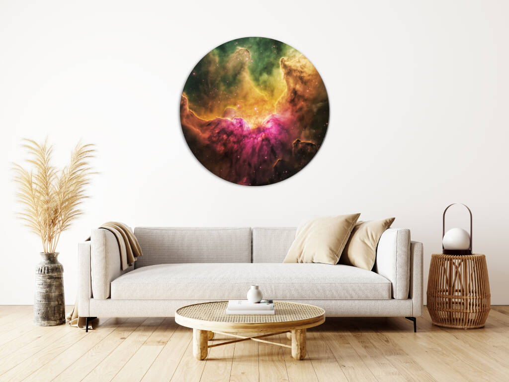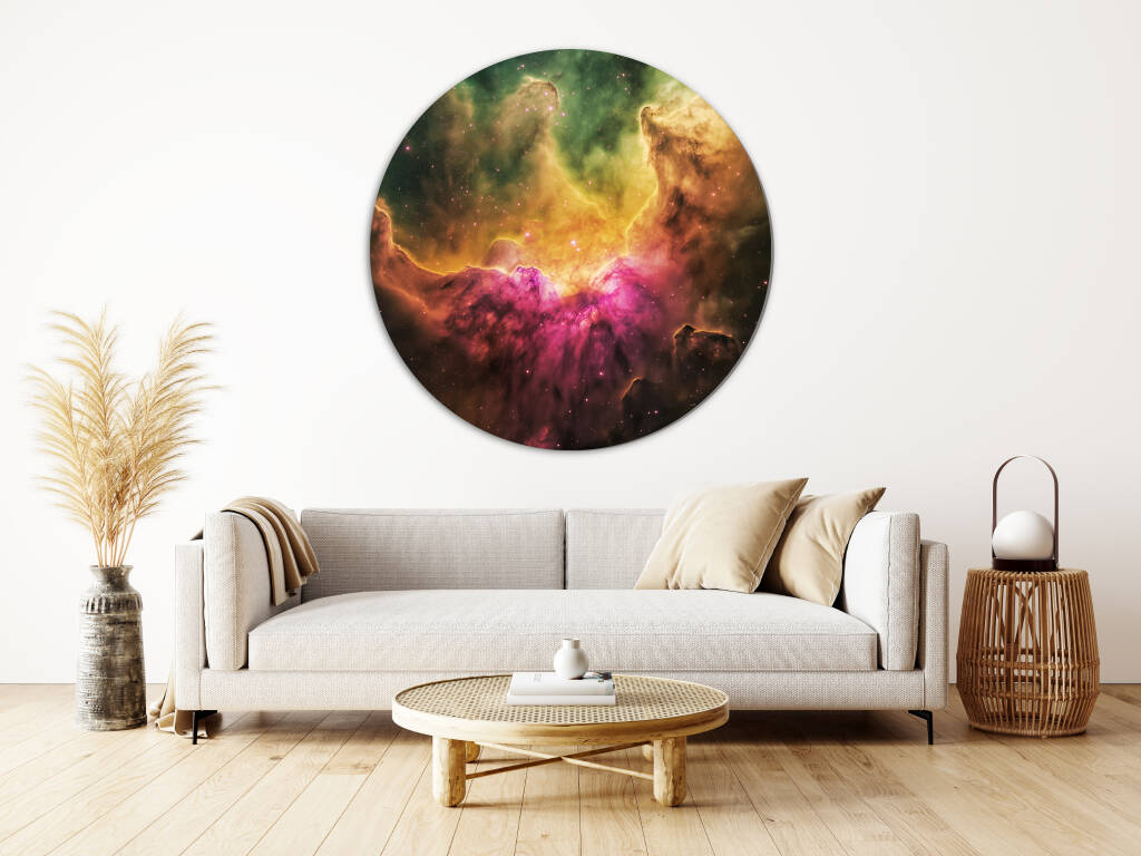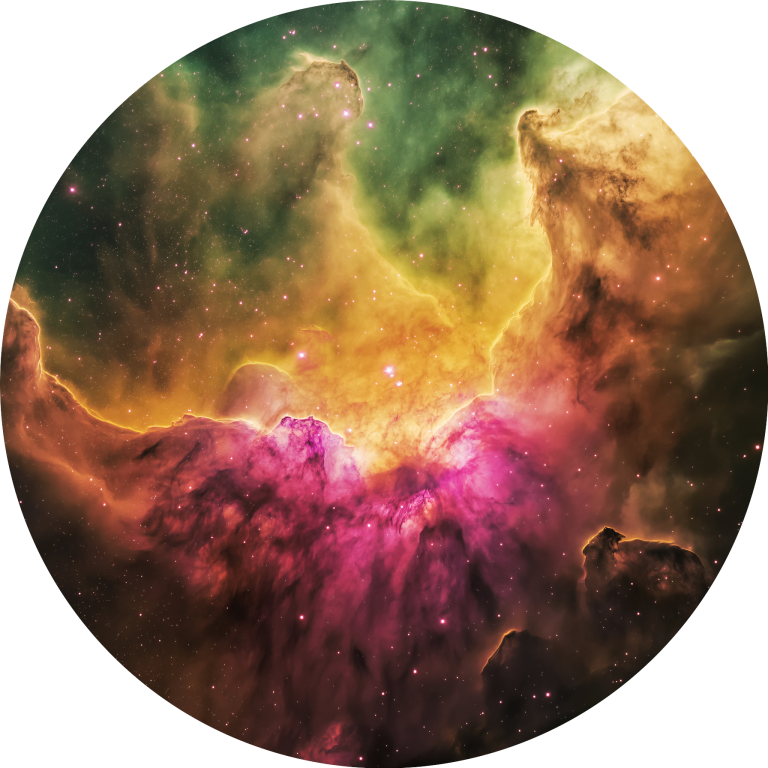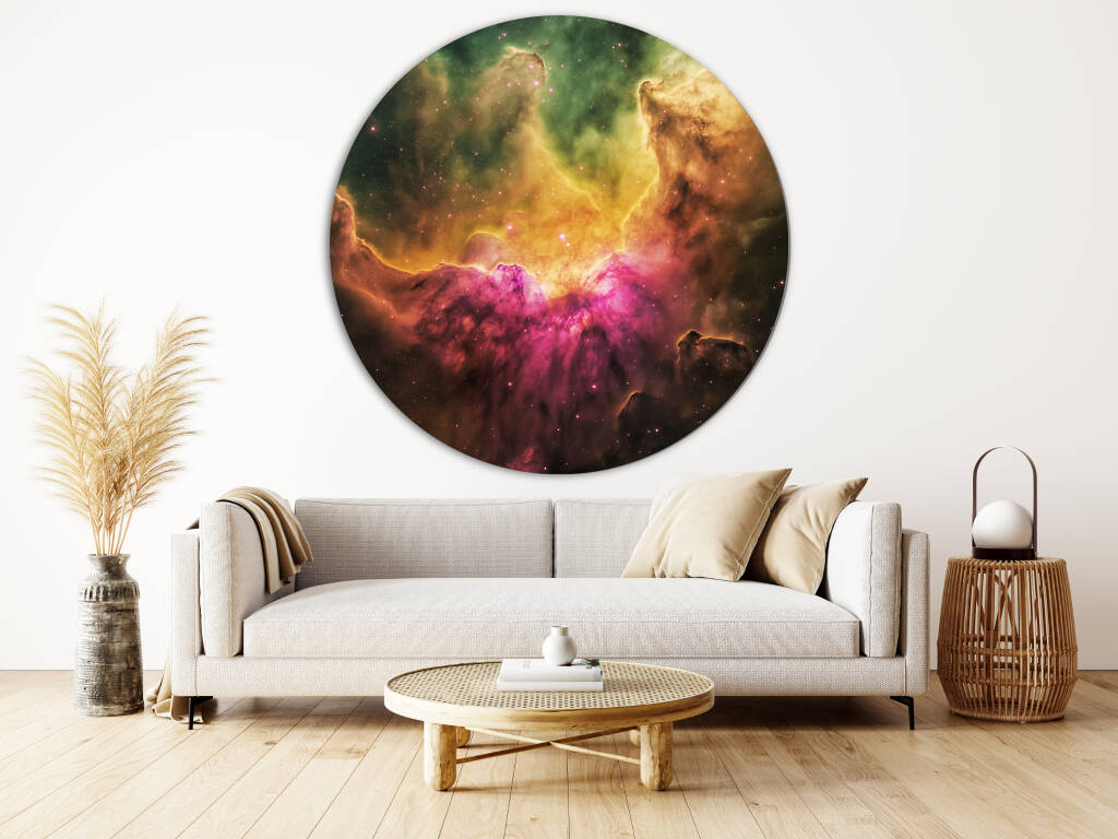 In deze adembenemende afbeelding zien we een diepe ruimte-nevel, een kosmisch kunstwerk gevormd door gigantische gas- en stofwolken die worden verlicht door de stralende energie van nabije sterren. De kleuren spatten van het doek: felroze en paars markeren actieve stervormingsgebieden, terwijl de warme goudgele en groene tinten een mystieke gloed over de nevel werpen. De complexe structuren, gevormd door interstellaire winden en straling, creëren een dramatisch spel van licht en schaduw, waardoor het lijkt alsof we een kijkje nemen in een levend universum. Dit beeld vangt de overweldigende grootsheid van de kosmos en herinnert ons eraan hoe oneindig en magisch het heelal is.