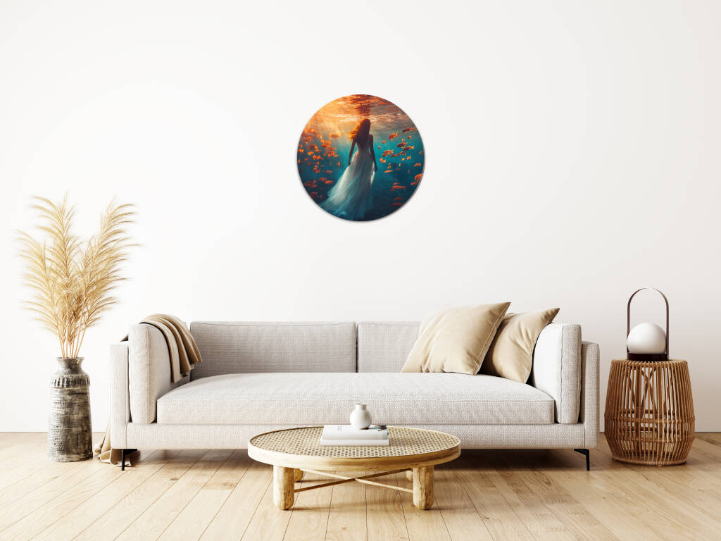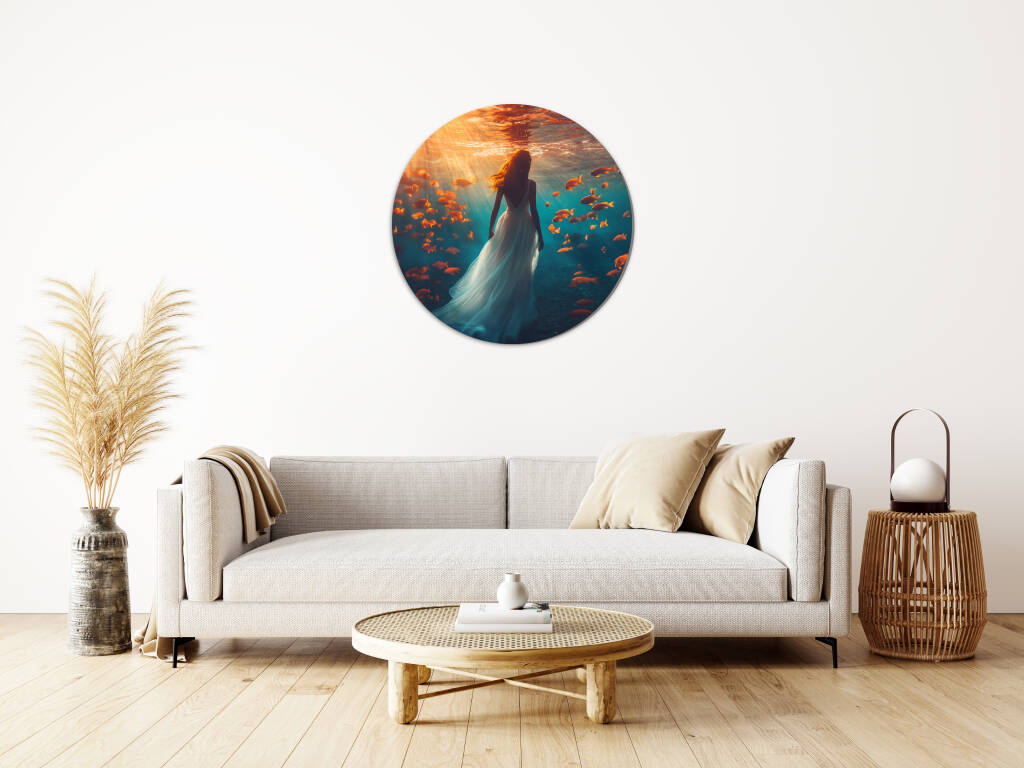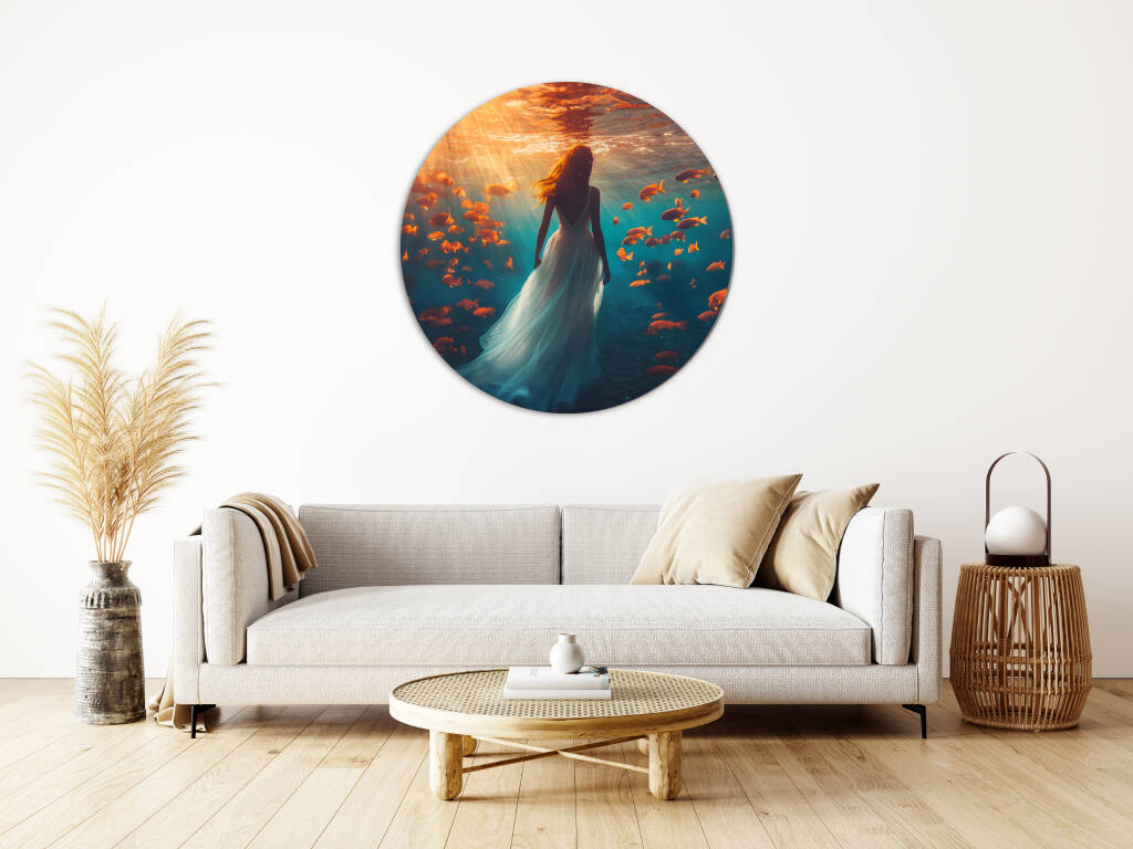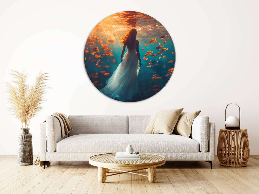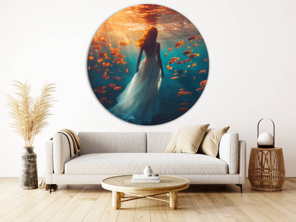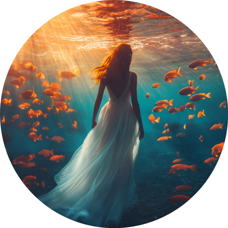 Underwater Walk toont een magische onderwaterscène waarin een elegante vrouw in een wijduitlopende jurk sereen wandelt door de diepten van de oceaan. Gouden zonnestralen doordringen het turquoise water en verlichten een school van oranje tropische vissen die graceus om haar heen zwemmen. De surrealistische scène creëert een dromerige atmosfeer waarin de grenzen tussen realiteit en fantasie vervagen. Dit betoverende kunstwerk symboliseert vrede, gratie en de harmonie tussen mens en natuur in een wereld vol wonderen.