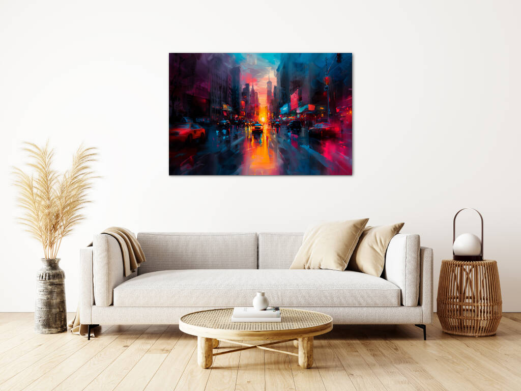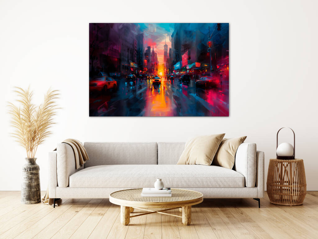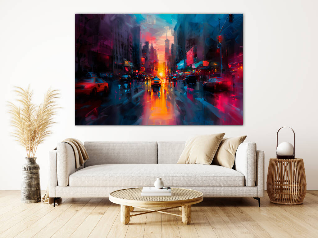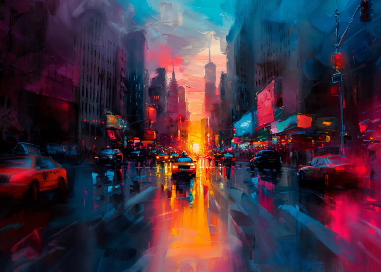 Hello New York is een dynamische en kleurrijke impressie van een bruisende New Yorkse straat bij zonsopgang. De schildering vangt de energie van de stad die nooit slaapt, met de warme oranje en roze gloed van de opkomende zon die reflecteert op de natte wegen. Gele taxi's en auto's banen zich een weg door het drukke verkeer, terwijl neonreclames en verlichte billboards aan de zijkanten de stad tot leven laten komen. De wolkenkrabbers torenen hoog op, hun contouren vervagend in de mistige, blauw getinte lucht. De losse, expressieve penseelstreken versterken het gevoel van beweging en stadsdrukte, alsof de stad zelf ademhaalt en ontwaakt.