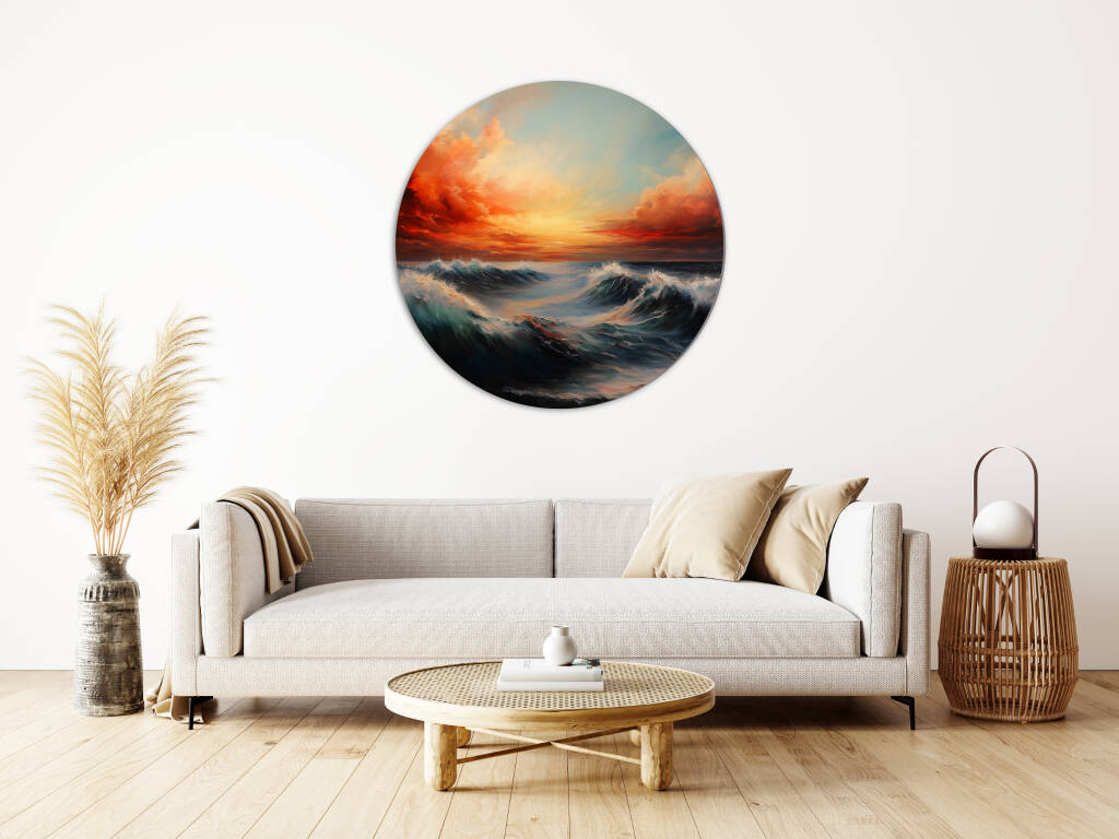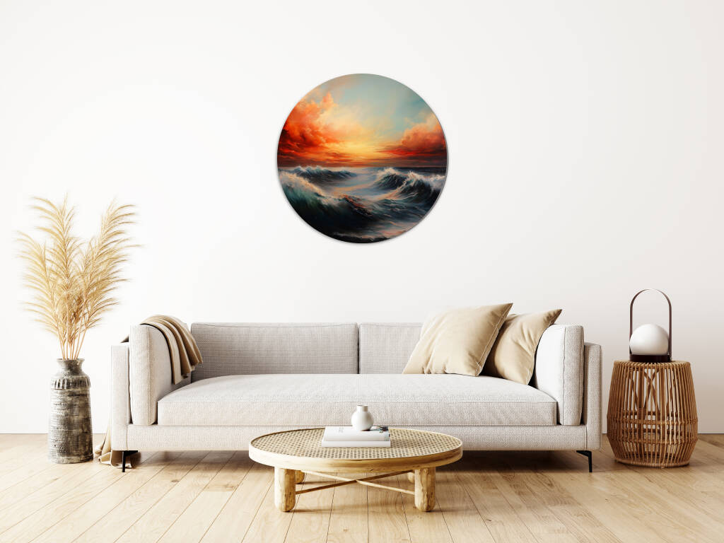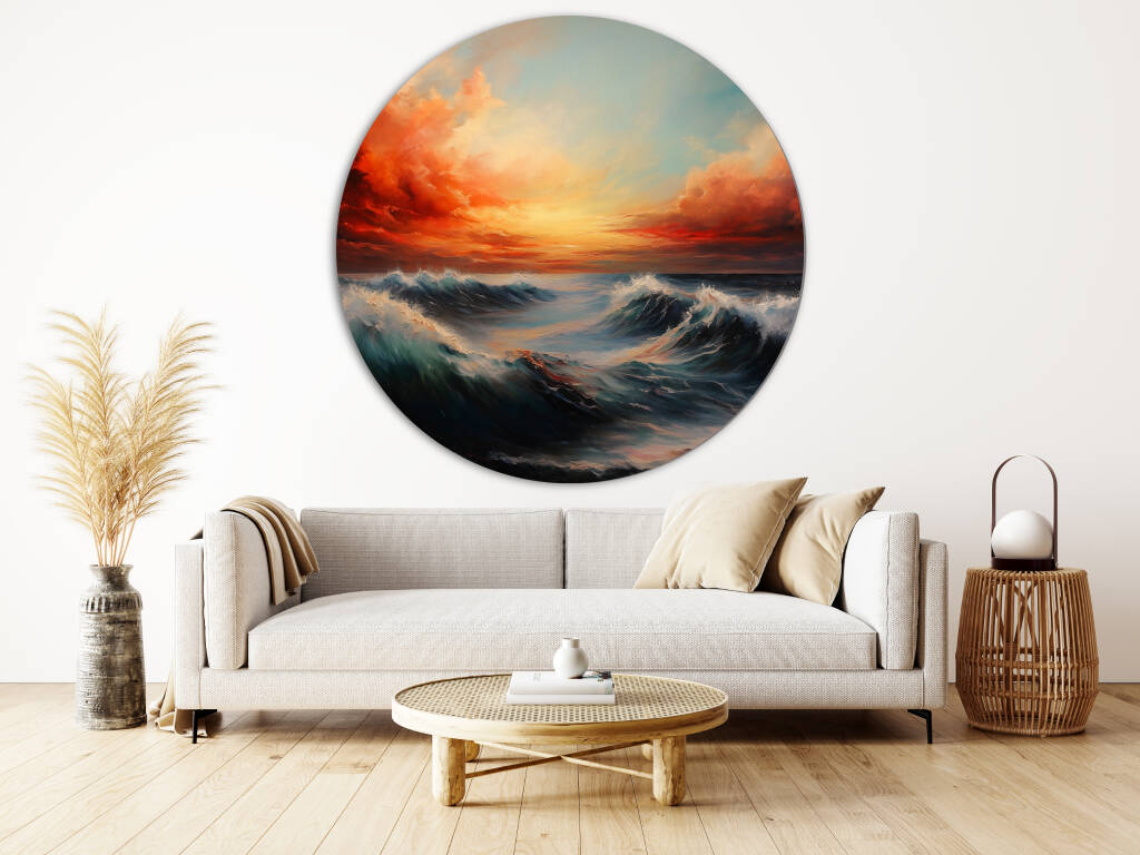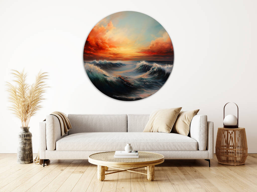 Eye of the Storm vangt het dramatische moment waarin woeste oceaangolven botsen onder een spectaculaire hemel vol oranje en gouden wolken. De krachtige beweging van het water en de intense kleuren van de storm creëren een meeslepende ervaring die zowel de kracht als de schoonheid van de natuur toont. De dynamische compositie en de rijke texturen geven het kunstwerk een gevoel van rauwe energie en natuurlijke pracht. Dit indrukwekkende zeegezicht brengt de majesteit van de oceaan en haar ontembare kracht direct in je leefruimte.