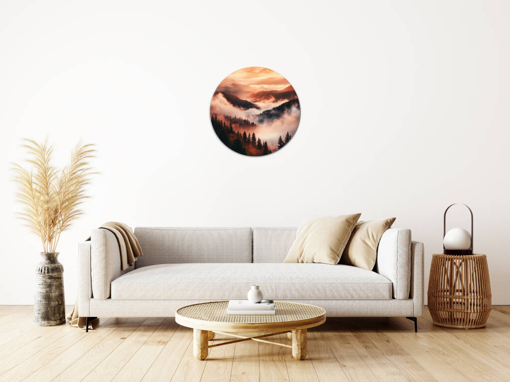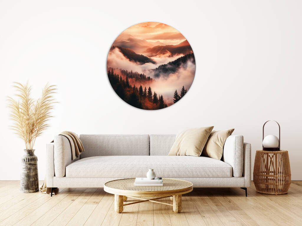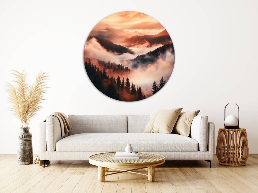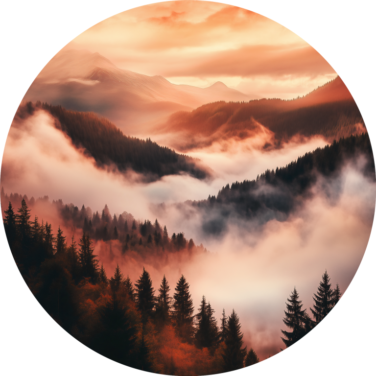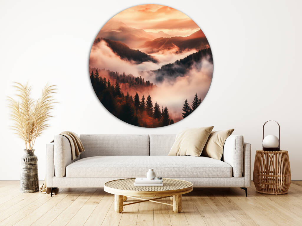 Misty Mountain onthult een adembenemend berglandschap gehuld in mysterieuze nevels en het warme licht van de gouden uurtjes. De dramatische oranje hemel contrasteert prachtig met de zachte mistsluiers die door de valleien dansen, terwijl donkere dennenbomen als wachters op de voorgrond staan. Dit sfeervolle landschap straalt rust en grootsheid uit, een ode aan de ongetemde schoonheid van de natuur. Perfect voor wie verlangt naar de sereniteit van berglandschappen en de magie van het gouden uur.