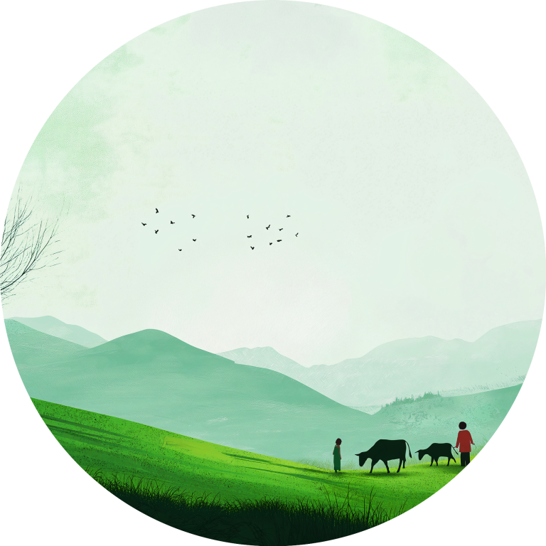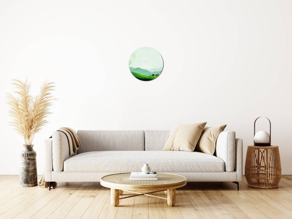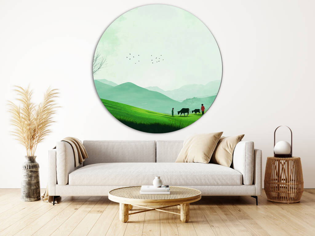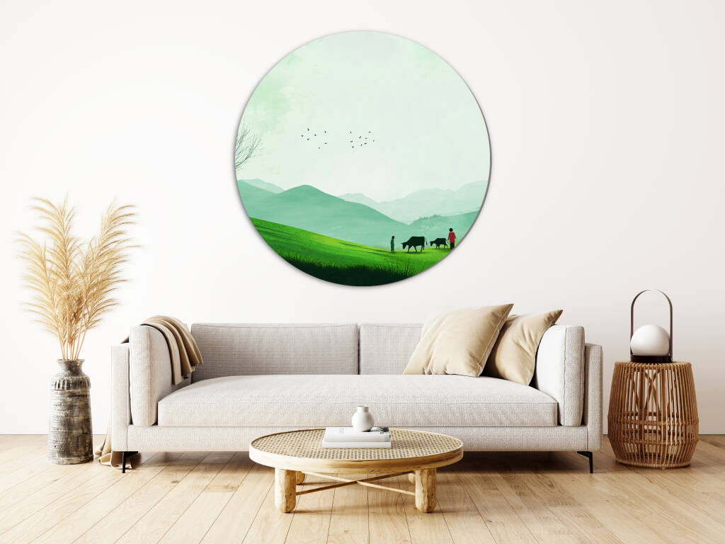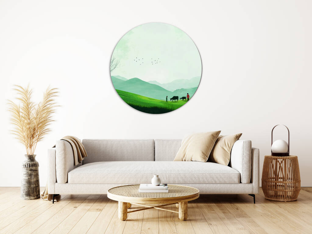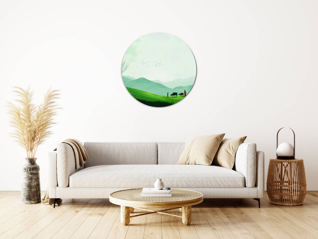 Green Fields toont een rustgevend landschap van glooiende groene heuvels waar herders hun kudde leiden door een vredige vallei. De zachte groentinten van het gras contrasteren prachtig met de mistige bergen in de verte, terwijl vogels graceus door de serene lucht zweven. De minimalistische compositie en de harmonieuze kleuren creëren een gevoel van diepe rust en verbondenheid met de natuur. Dit pastorale kunstwerk brengt de tijdloze schoonheid van het platteland en de eenvoud van het landelijke leven in je interieur.