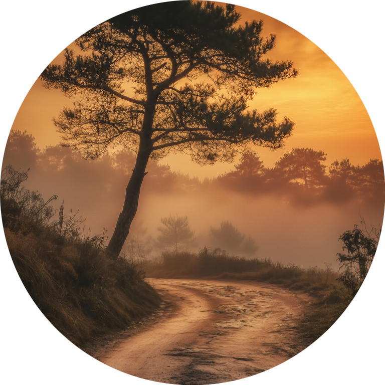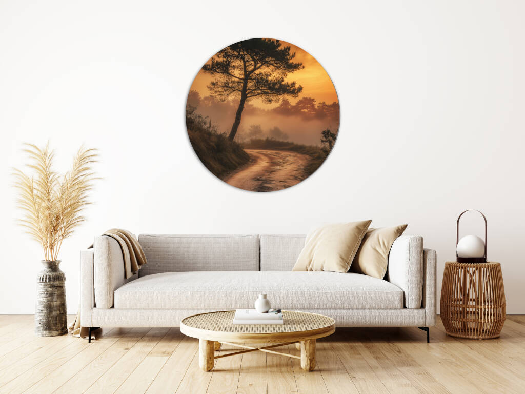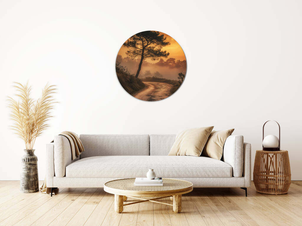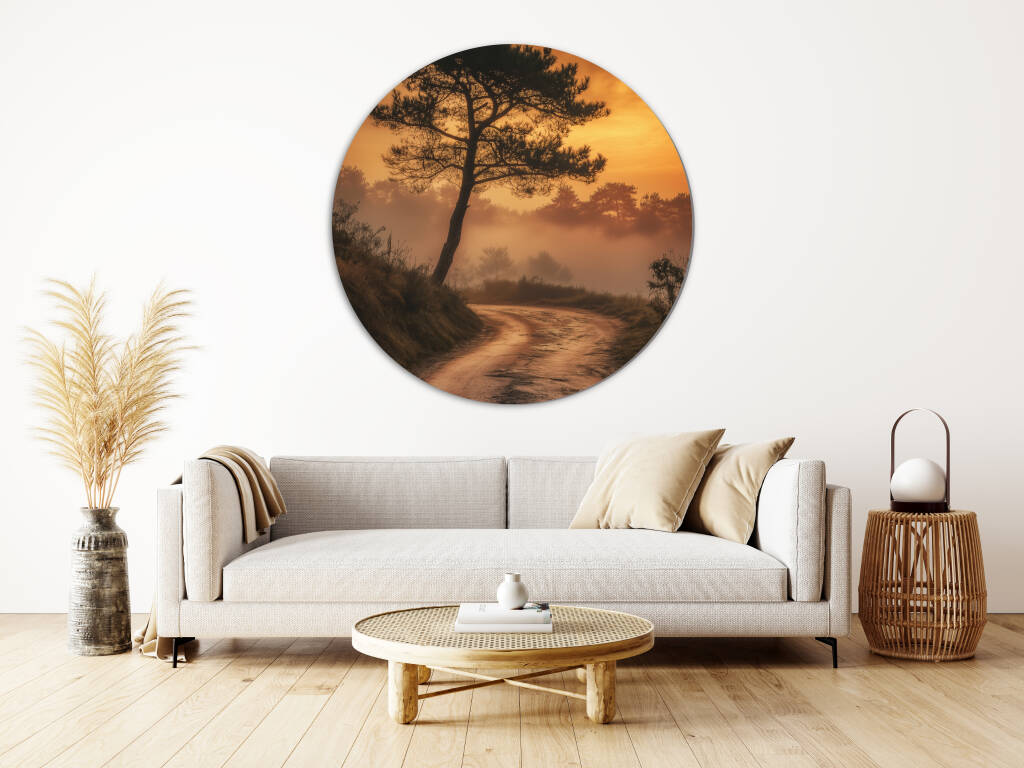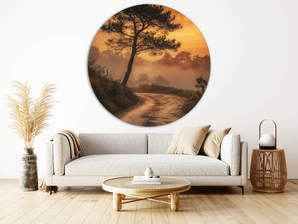 Dit kunstwerk toont een sfeervol en warm landschap met een slingerende weg die zich een weg baant door een mistige omgeving. Een majestueuze boom staat prominent in beeld, zijn silhouet scherp afgetekend tegen de prachtige gouden lucht van een zonsopkomst. De warme aardetinten en het zachte licht creëren een rustgevende en dromerige sfeer. Dit beeld roept gevoelens van sereniteit en avontuur op, alsof het uitnodigt om de weg te volgen en de mysteries van de ochtend te ontdekken.
