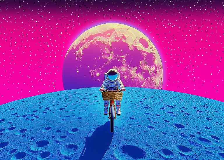 Een astronaut fietst over een ruig landschap onder een magische, neonroze sterrenhemel met een gigantische, gloeiende maan op de achtergrond. De scène straalt een speelse mix uit van nostalgie en futurisme, ruimteverkenning lijkt een alledaagse activiteit geworden. De contrasterende kleuren, diepe blauwtinten van de maan en de felle roze hemel geven het beeld een dromerige, surrealistische sfeer.