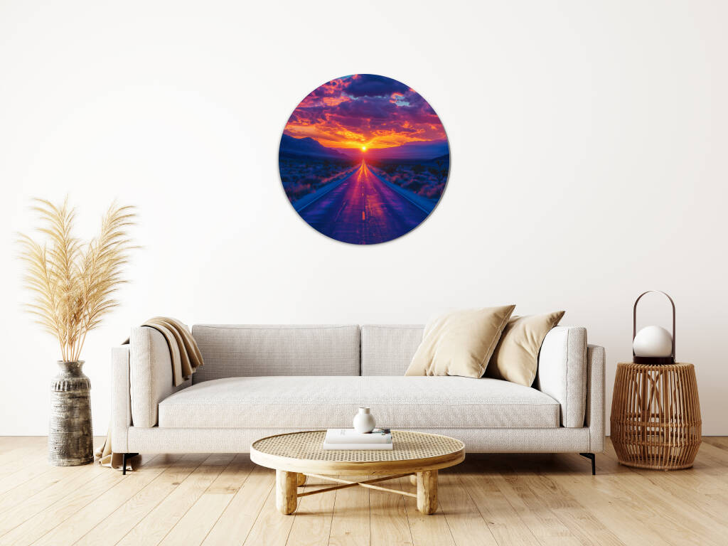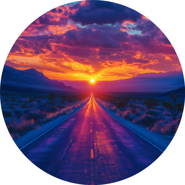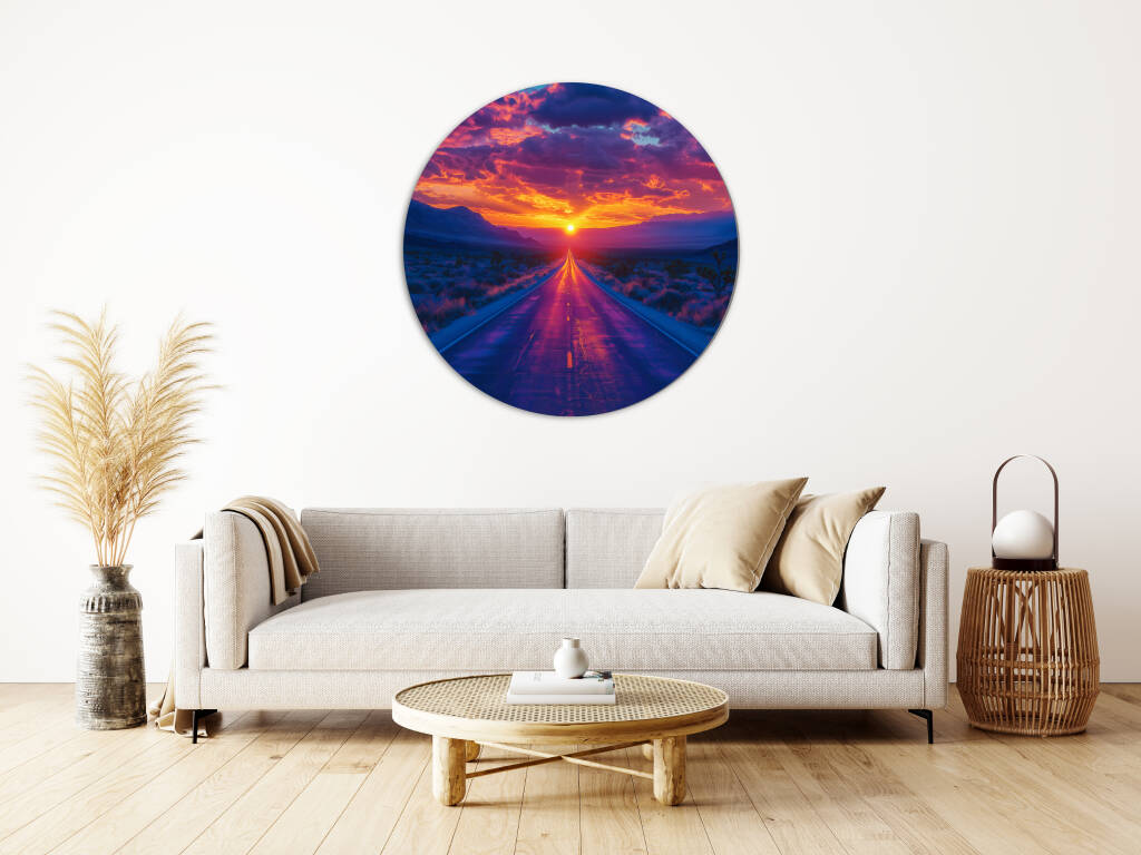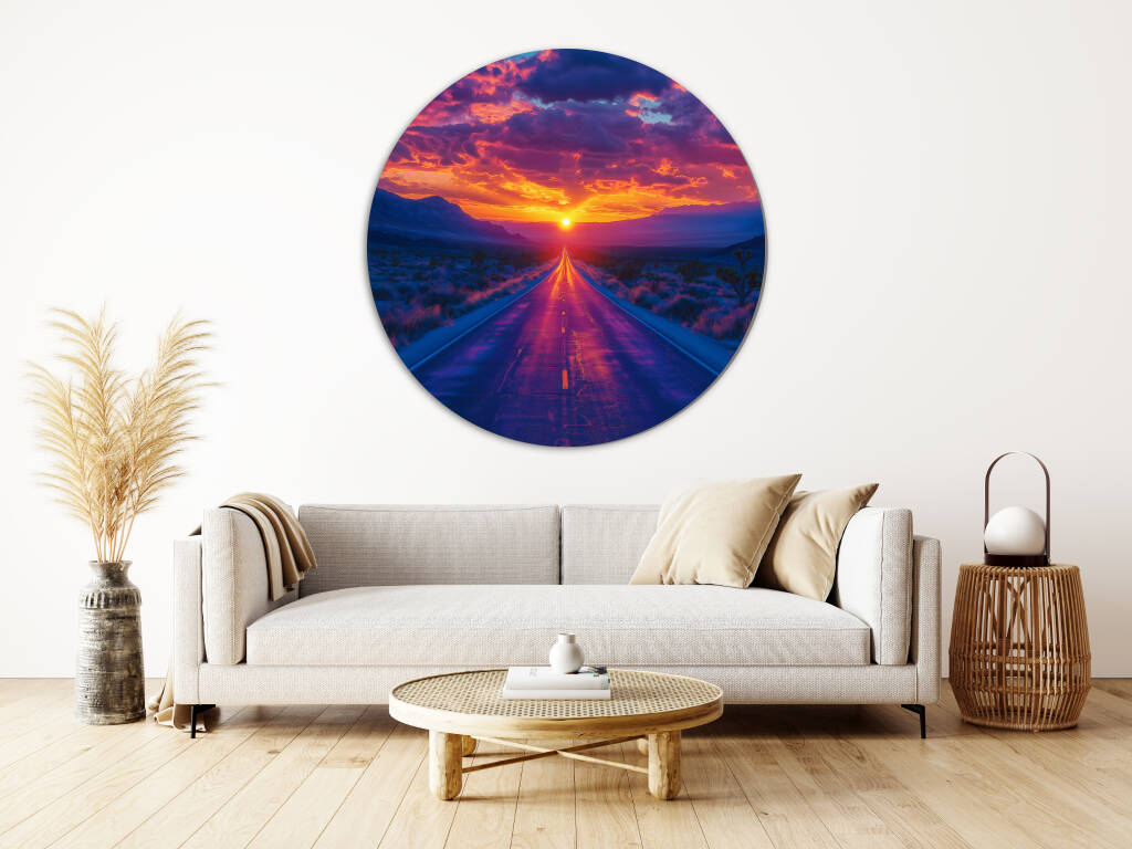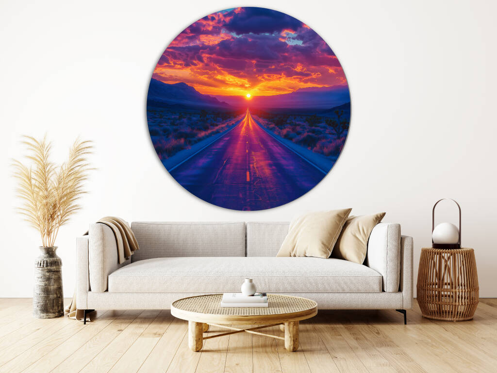 Sunset Road vangt het magische moment waarop de zon de horizon kust en de eindeloze weg in gouden en paarse tinten baadt. De dramatische wolkenformaties en het perfecte perspectief nodigen uit tot dromen over verre reizen en nieuwe avonturen. Dit inspirerende landschap symboliseert hoop, vrijheid en de belofte van wat achter de horizon ligt. Perfect voor avonturiers en dromerige zielen die verlangen naar de open weg en eindeloze mogelijkheden.