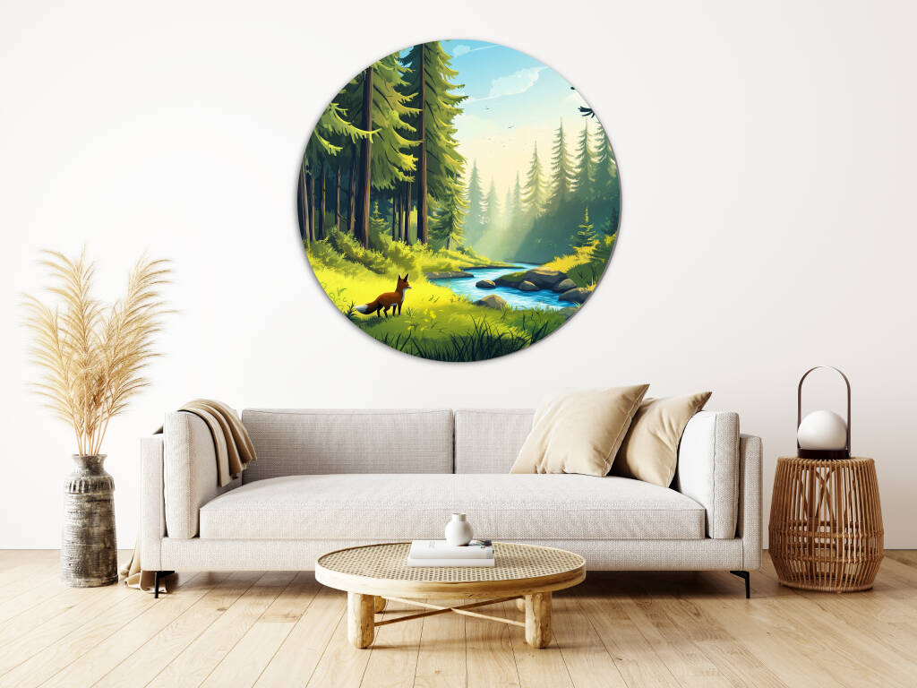 Fox Paradise toont een idyllisch boslandschap waar een nieuwsgierige vos langs een kabbelend beekje wandelt in het zachte ochtendlicht. De warme groentinten en het vredige tafereel stralen pure natuurlijke harmonie uit, terwijl zonnestralen door de dennenbomen filteren. Dit sprookjesachtige kunstwerk vangt de ongerepte schoonheid van het woud en zijn bewoners. Perfect voor natuurliefhebbers en kinderen die dromen van bosavonturen en vriendelijke dieren.