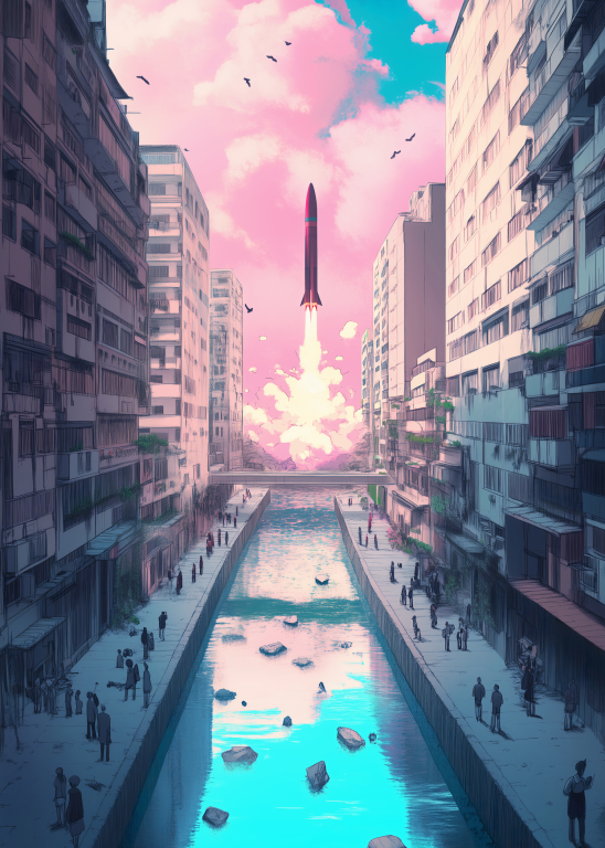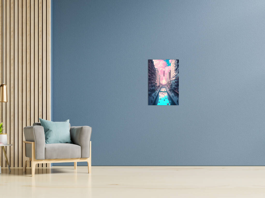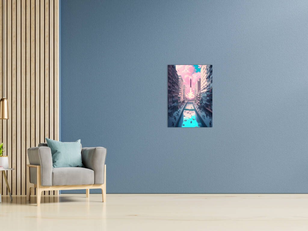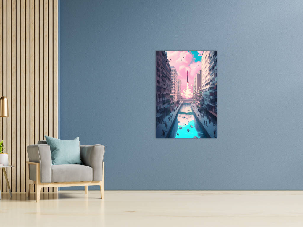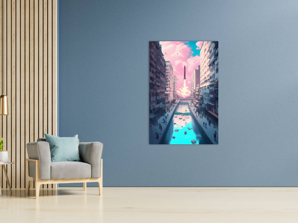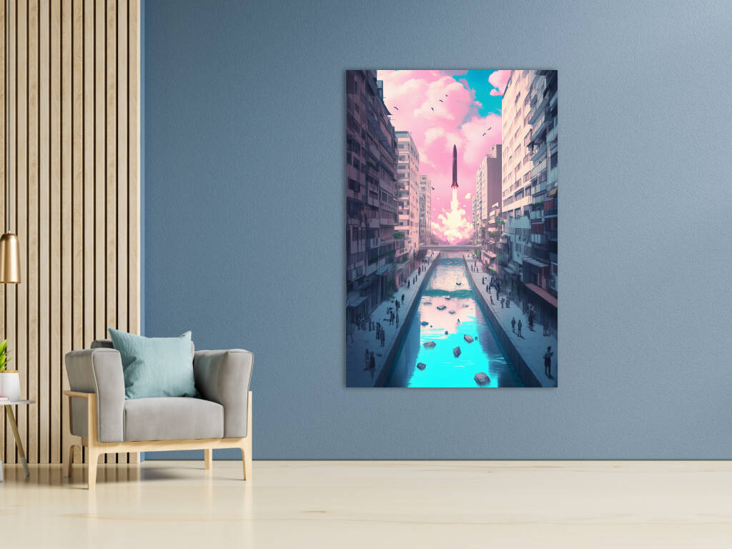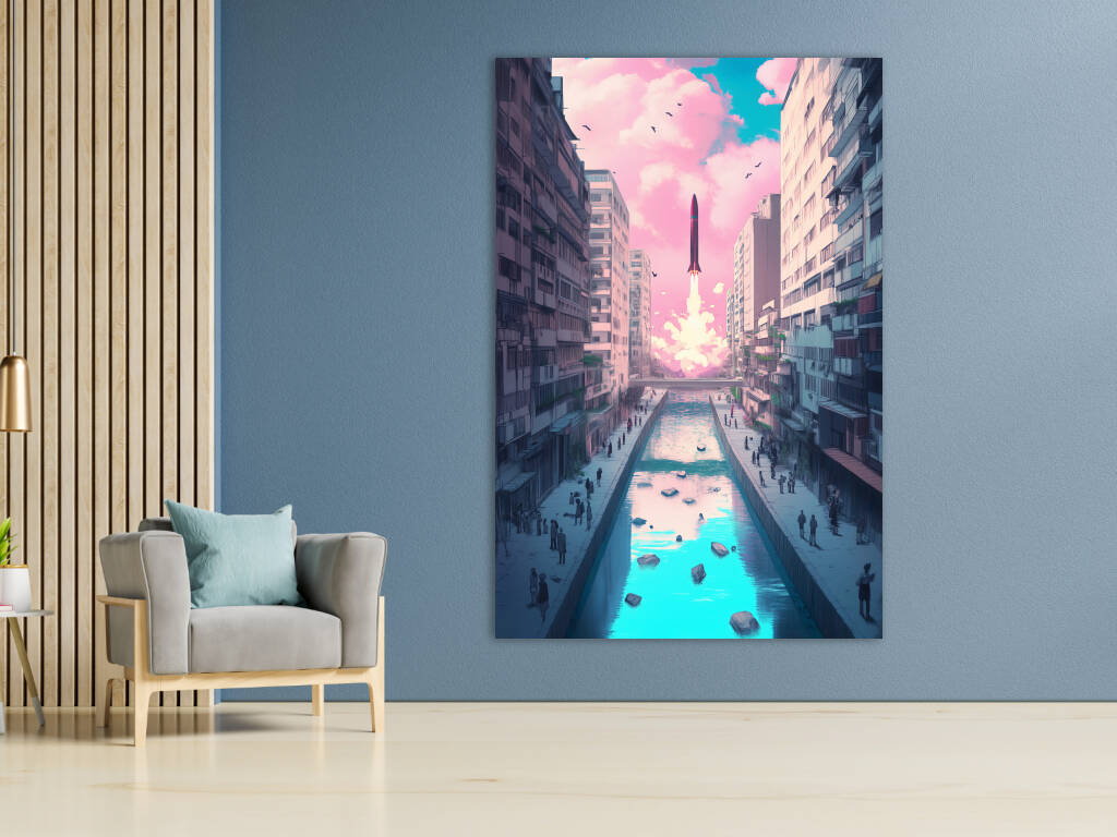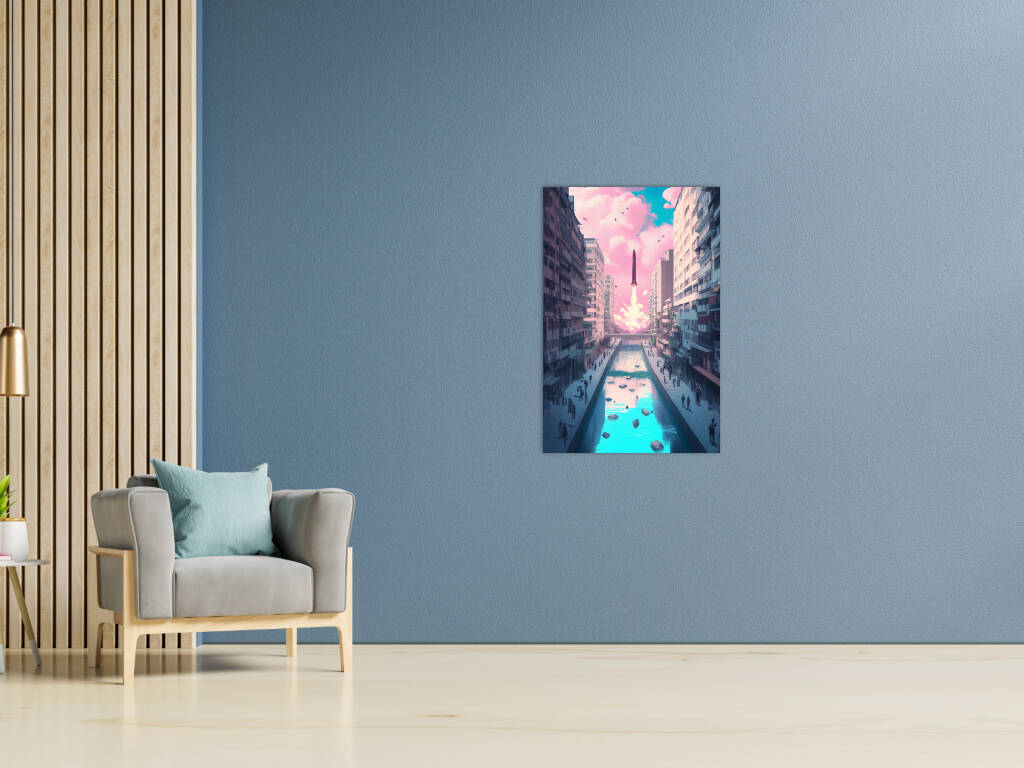 Time to Leave presenteert een surrealistische stadsgezicht waarin een raket opstijgt uit het hart van een moderne stad, waarbij de realiteit van het dagelijks leven botst met dromen van ontsnapping. De roze en blauwe lucht contrasteert met de grijze gebouwen, terwijl mensen als kleine figuren door de straten wandelen, ogenschijnlijk onwetend van het spectaculaire vertrek boven hun hoofden. Het turquoise kanaal dat door de stad stroomt weerspiegelt de dromerige hemel en versterkt het gevoel van transformatie. Dit thought-provoking kunstwerk symboliseert de drang naar avontuur en het verlaten van het bekende.