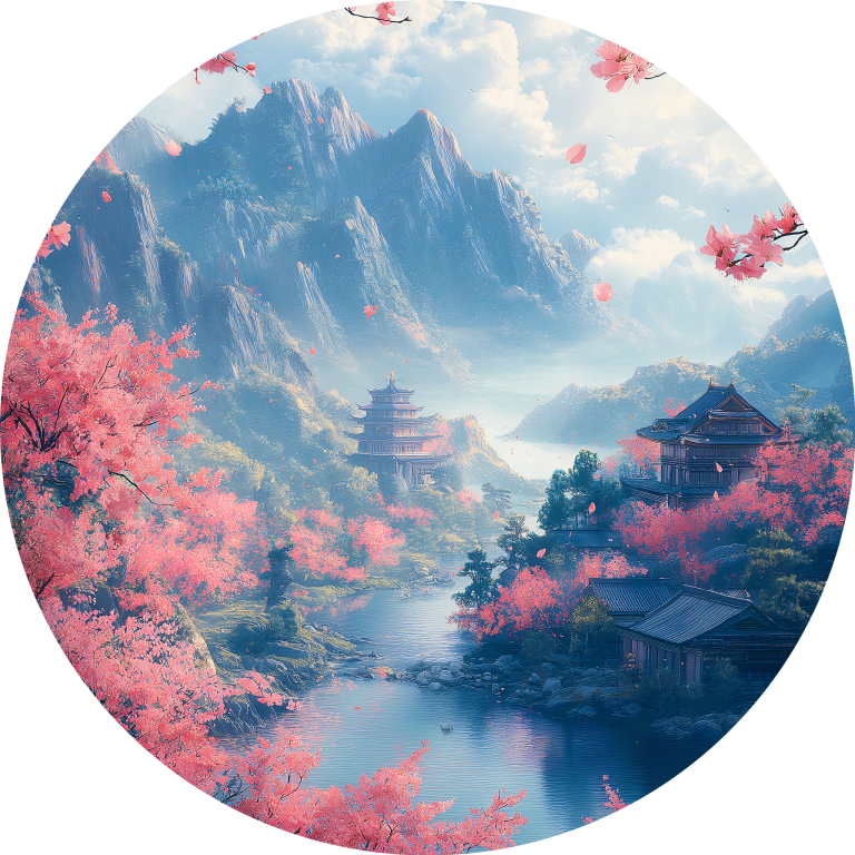 Peaceful Valley toont een betoverend Aziatisch landschap waarin een serene rivier zich slingert door een vallei vol roze kersenbloesems. De traditionele tempels en paviljoens nestelen zich harmonieus tussen de bloeiende bomen, terwijl majestueuze bergen zich verheffin in de mistige verte. De zachte pastelkleuren en de dromerige atmosfeer creëren een gevoel van pure tranquilliteit en spirituele rust. Dit poëtische kunstwerk brengt de tijdloze schoonheid van de Oosterse natuur en architectuur in een perfect evenwicht van sereniteit en elegantie.