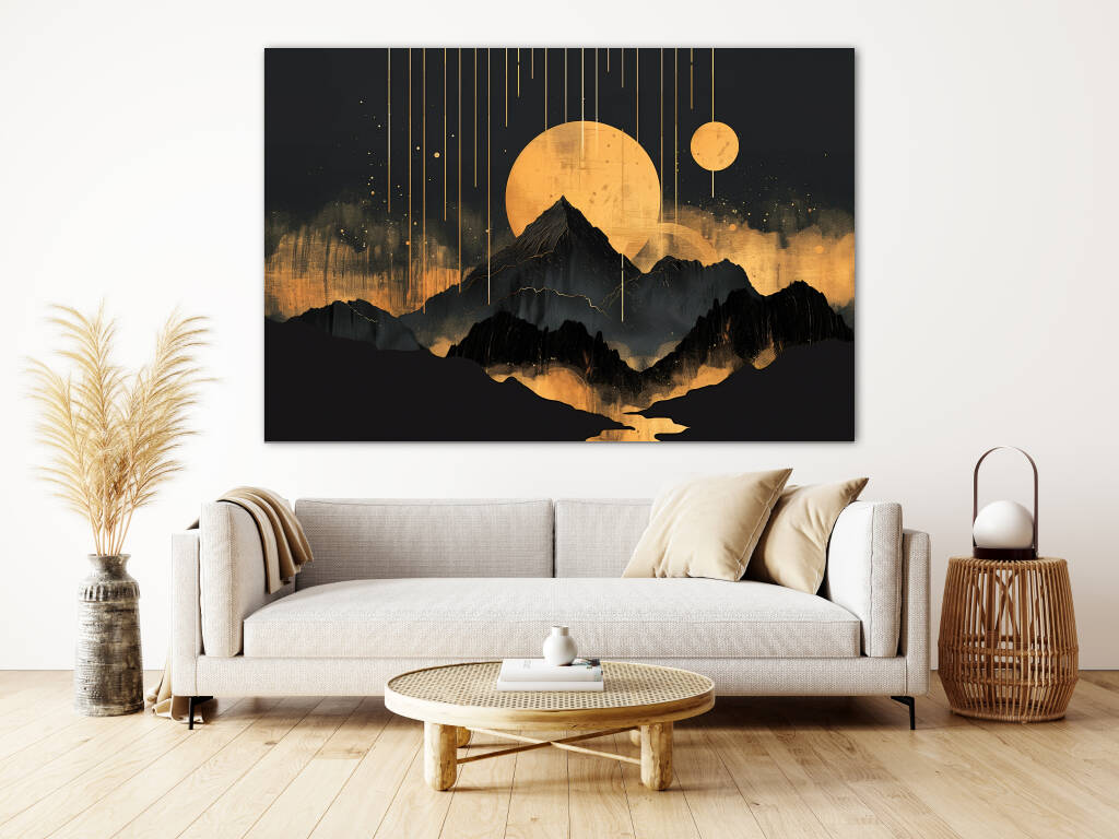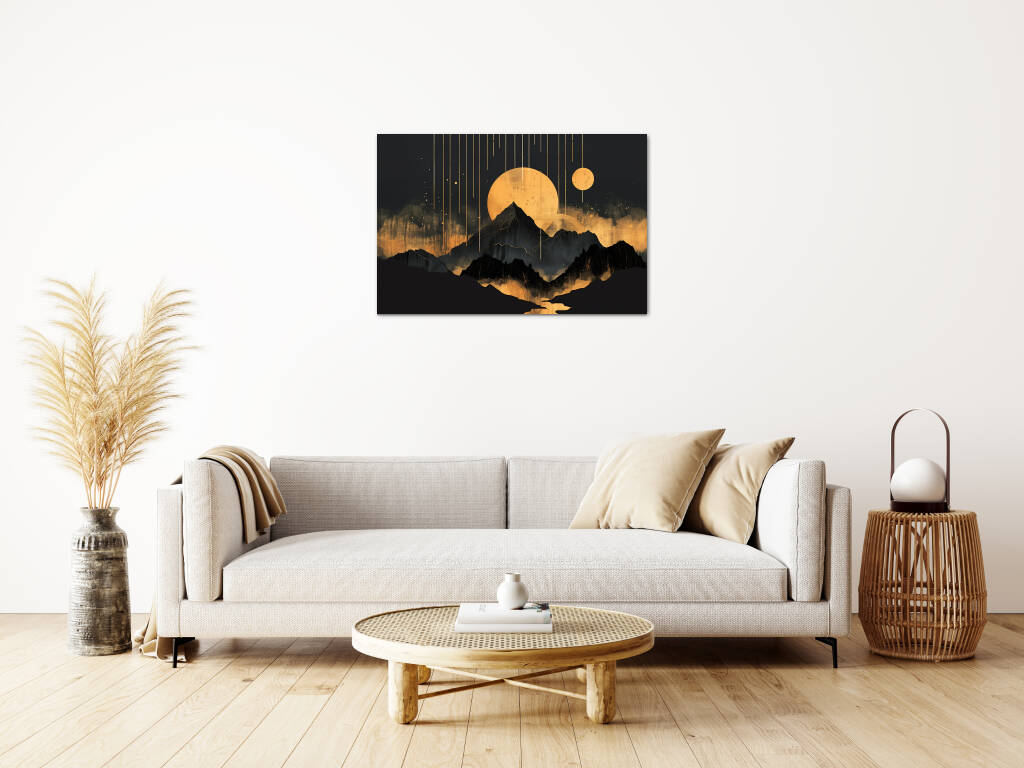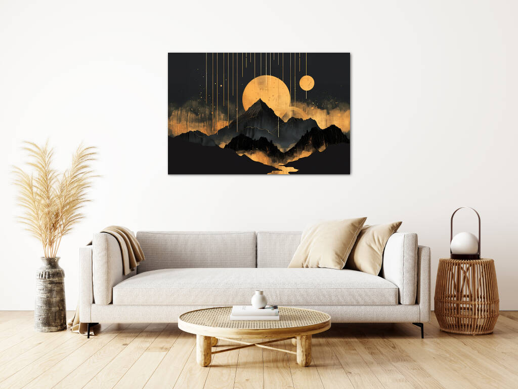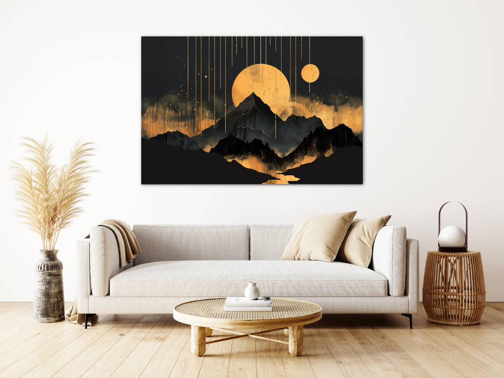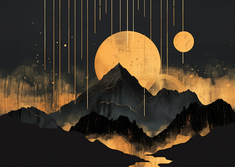 Golden Mountain presenteert een mystiek berglandschap waar gouden lichtstralen als kosmische regen neerdalen op donkere bergtoppen. De warme gouden accenten tegen de diepe zwarte achtergrond creƫren een hypnotiserend contrast dat zowel aards als buitenaards aanvoelt. Dit contemplatieve kunstwerk straalt spirituele kracht en natuurlijke majesteit uit. Perfect voor wie houdt van minimalistische landschappen met een vleugje mystiek en de symboliek van goud als verlichting waardeert.