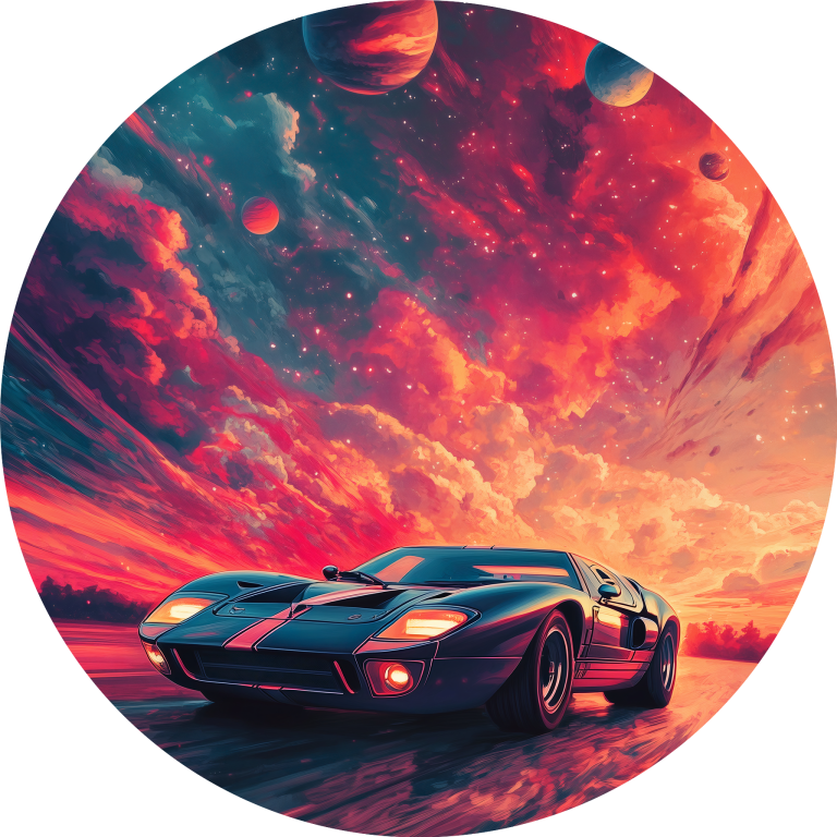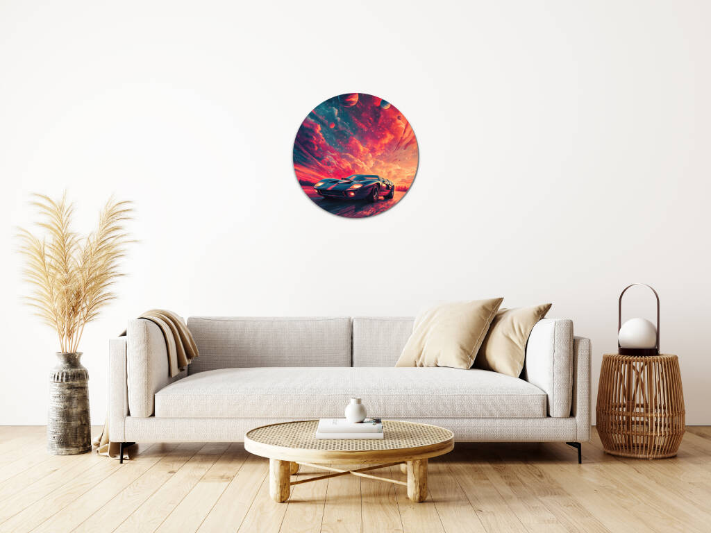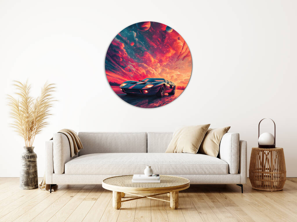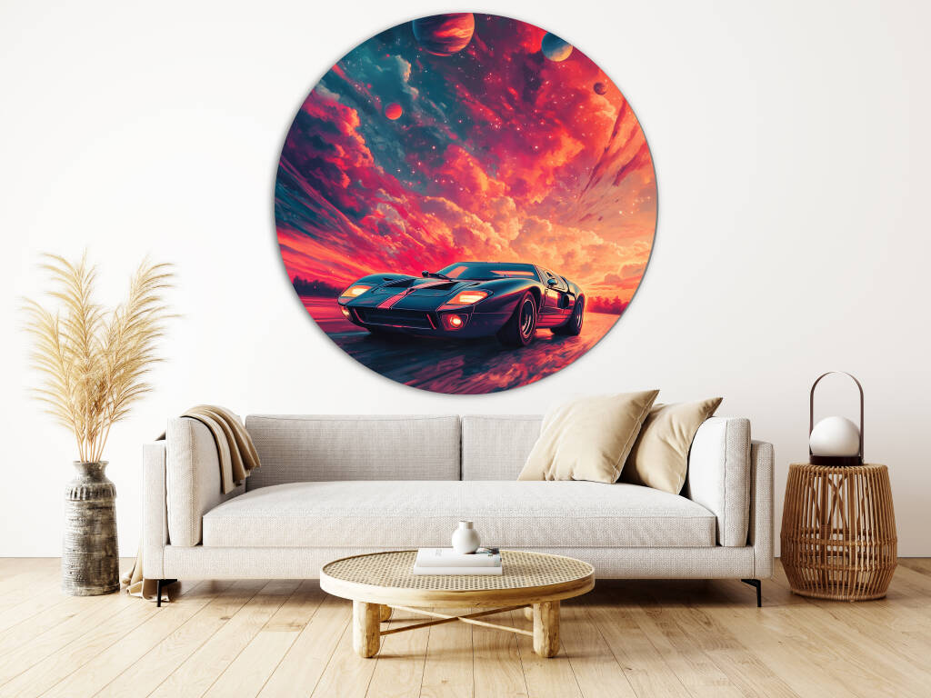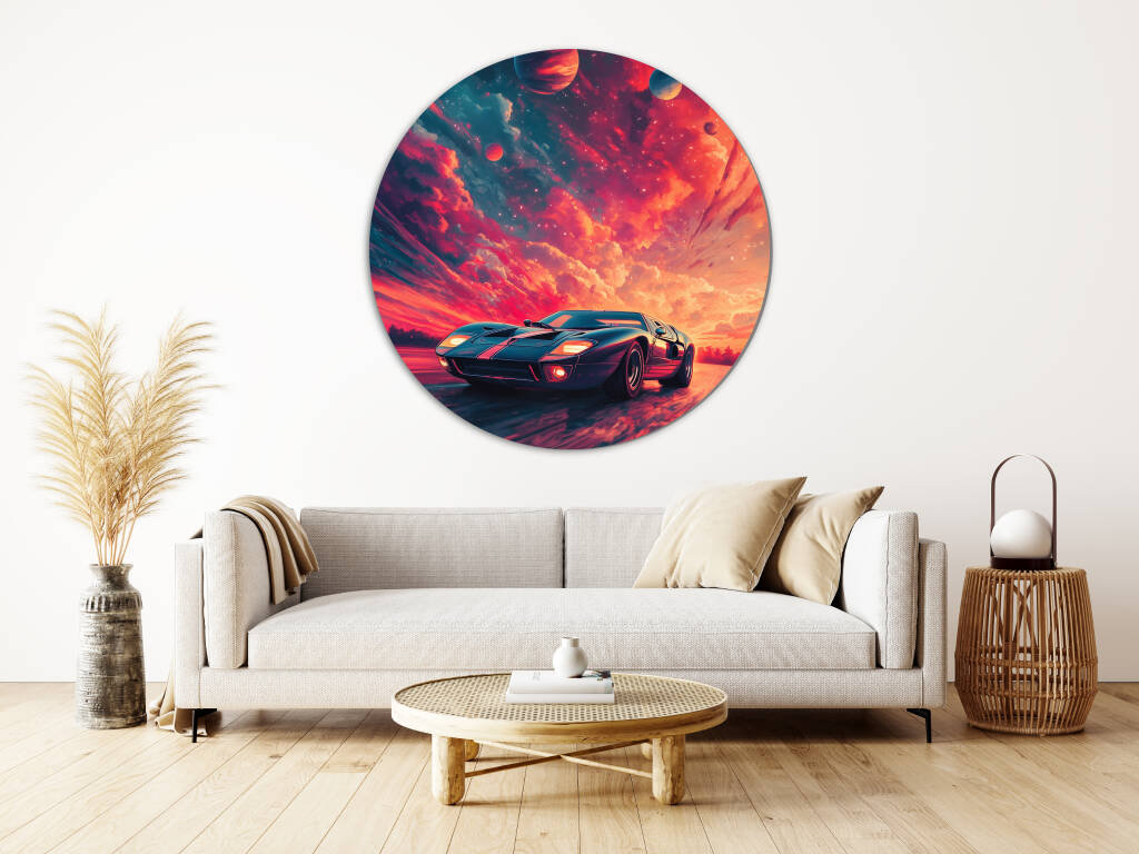 Exploration toont een futuristische sportwagen die door een kosmisch landschap raast onder een spectaculaire hemel vol planeten en sterren. De levendige rode en blauwe tinten van de ruimte contrasteren dramatisch met de donkere, gestroomlijnde vorm van het voertuig, terwijl lichtstralen en energiegolven beweging en snelheid suggereren. De surreële combinatie van aardse technologie en kosmische grandeur creëert een gevoel van grenzeloze avontuur en toekomstvisie. Dit dynamische kunstwerk brengt de opwinding van ontdekking en de droom van ruimtereizen in je interieur.