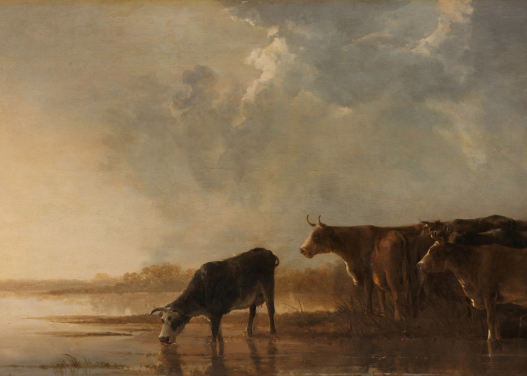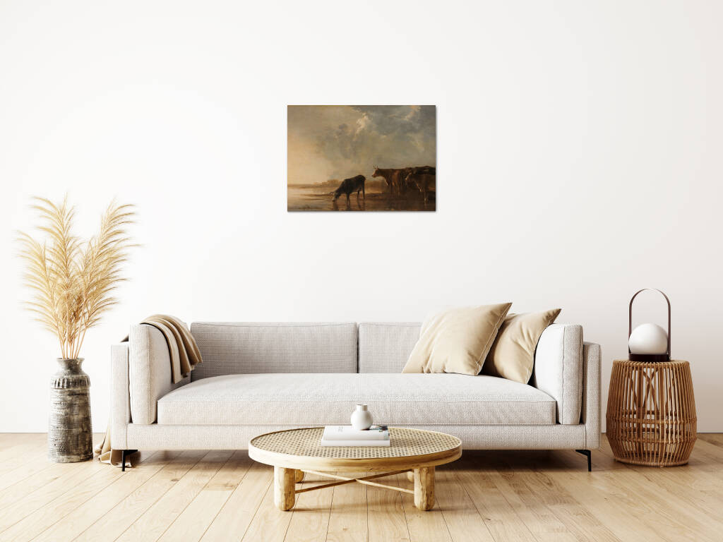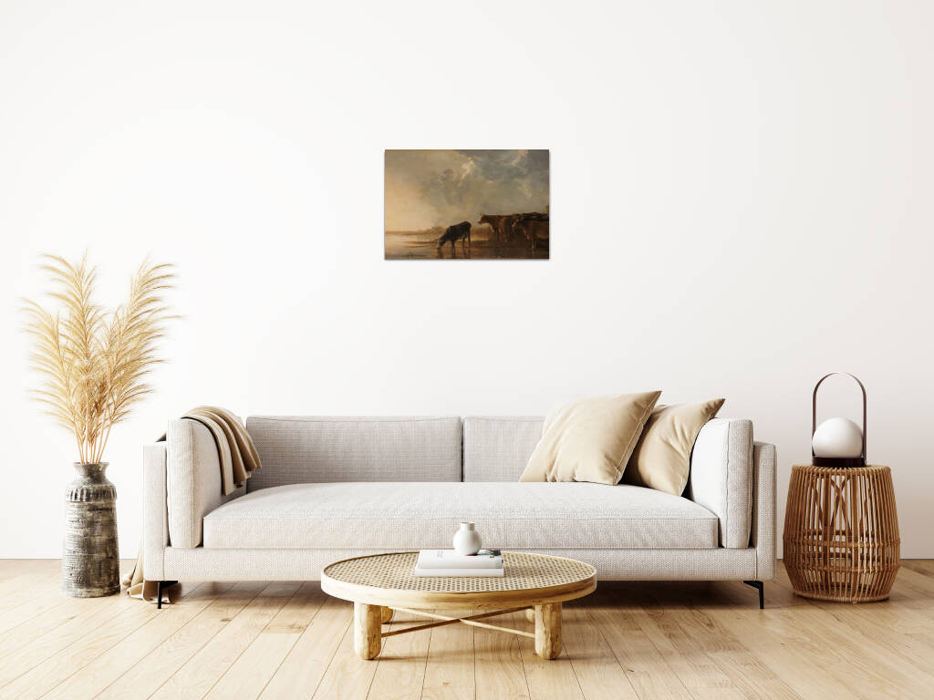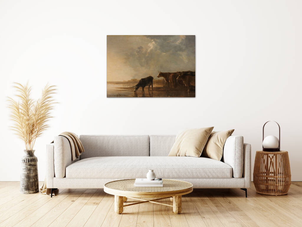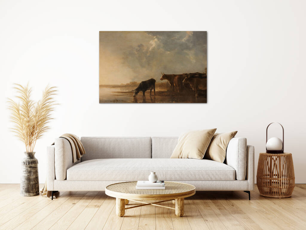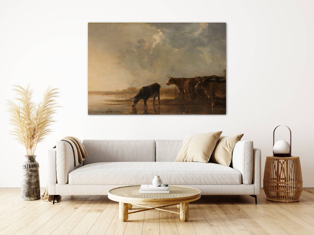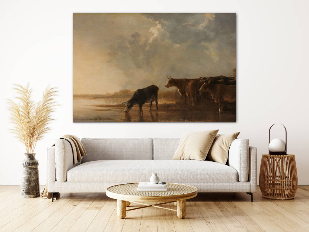 Rivierlandschap met Koeien belichaamt de tijdloze schoonheid van het Nederlandse polderlandschap. In het zachte licht van de late namiddag drinken koeien aan de oever van een kalme rivier, terwijl dramatische wolkenpartijen zich spiegelen in het water. De warme, gouden tinten van het zonlicht contrasteren prachtig met de dreigende lucht, wat een sfeer van verwachting creƫert. Dit pastorale tafereel uit de Gouden Eeuw vangt de essentie van het landelijke leven, waar mens en dier in harmonie leven met de natuur. De meesterlijke weergave van licht en atmosfeer, kenmerkend voor de Nederlandse landschapsschilderkunst, maakt dit tot een werk dat zowel rust als grandeur uitstraalt. Een ode aan de eenvoudige schoonheid van het Nederlandse platteland.